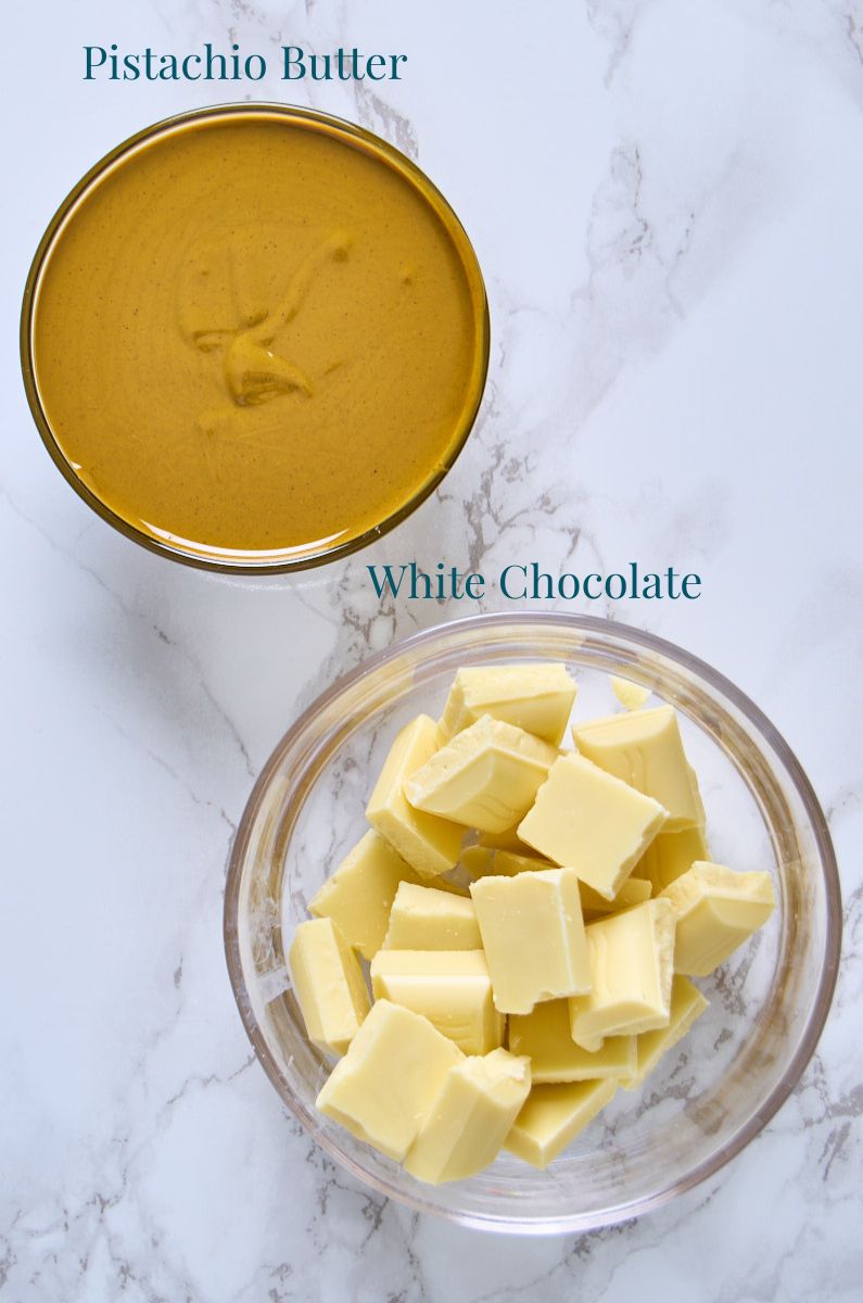 - The key ingredients are pistachio butter and white chocolate, resulting in a perfectly smooth cream.