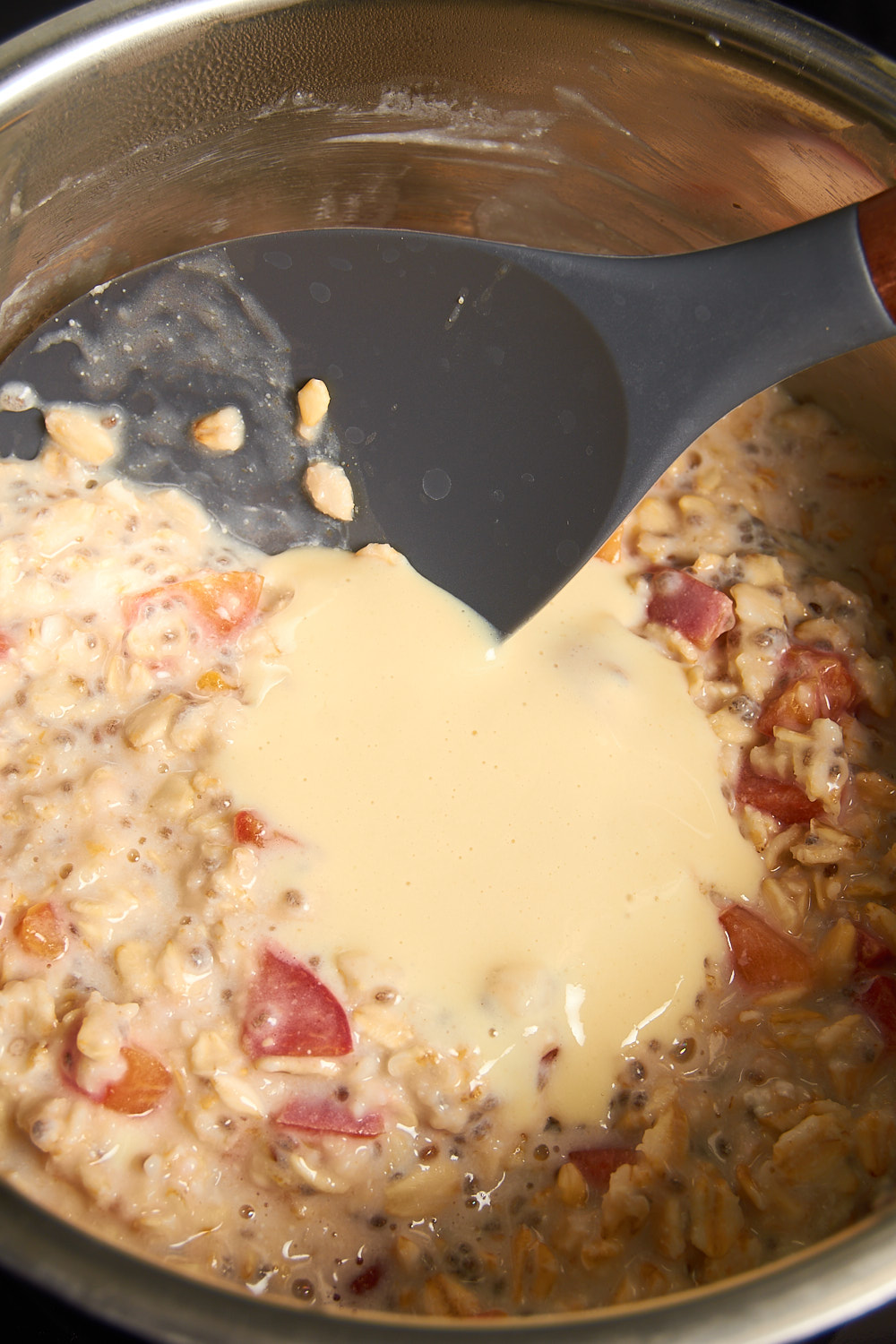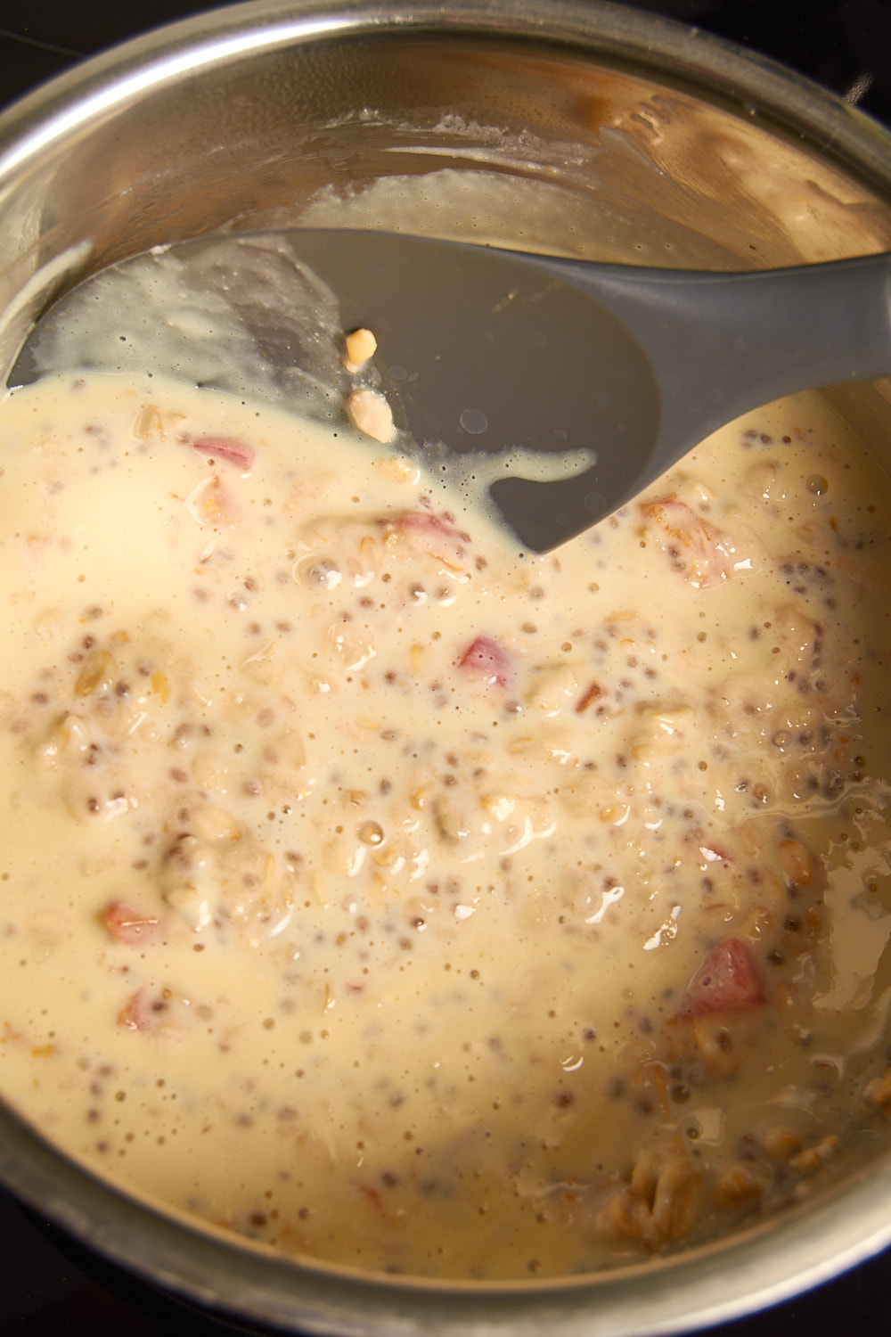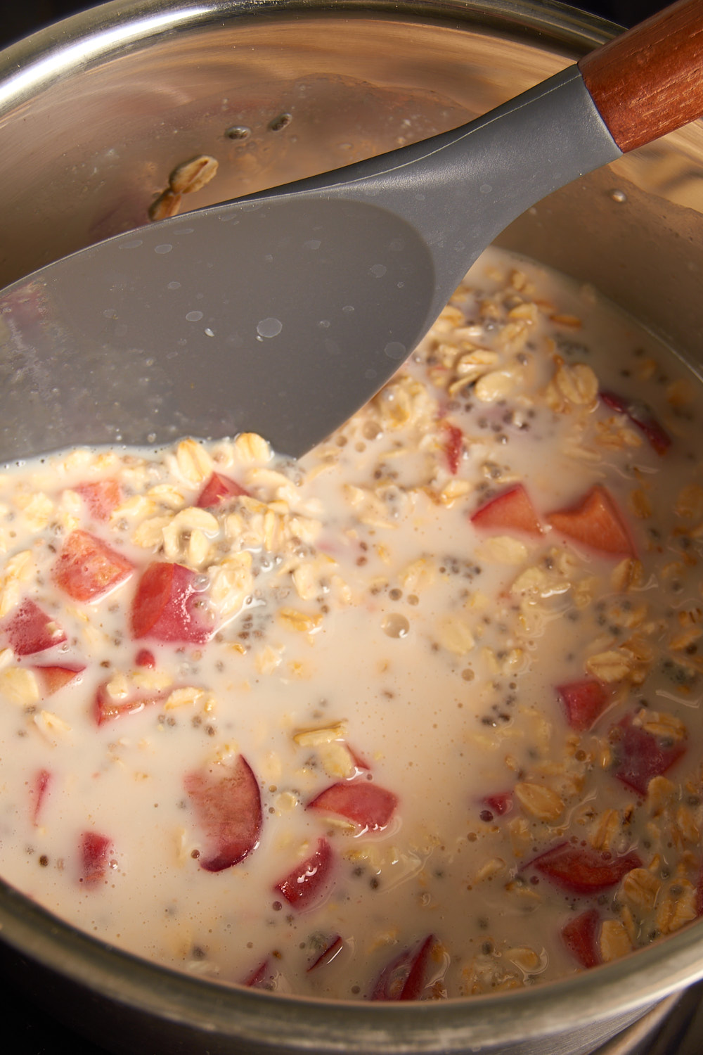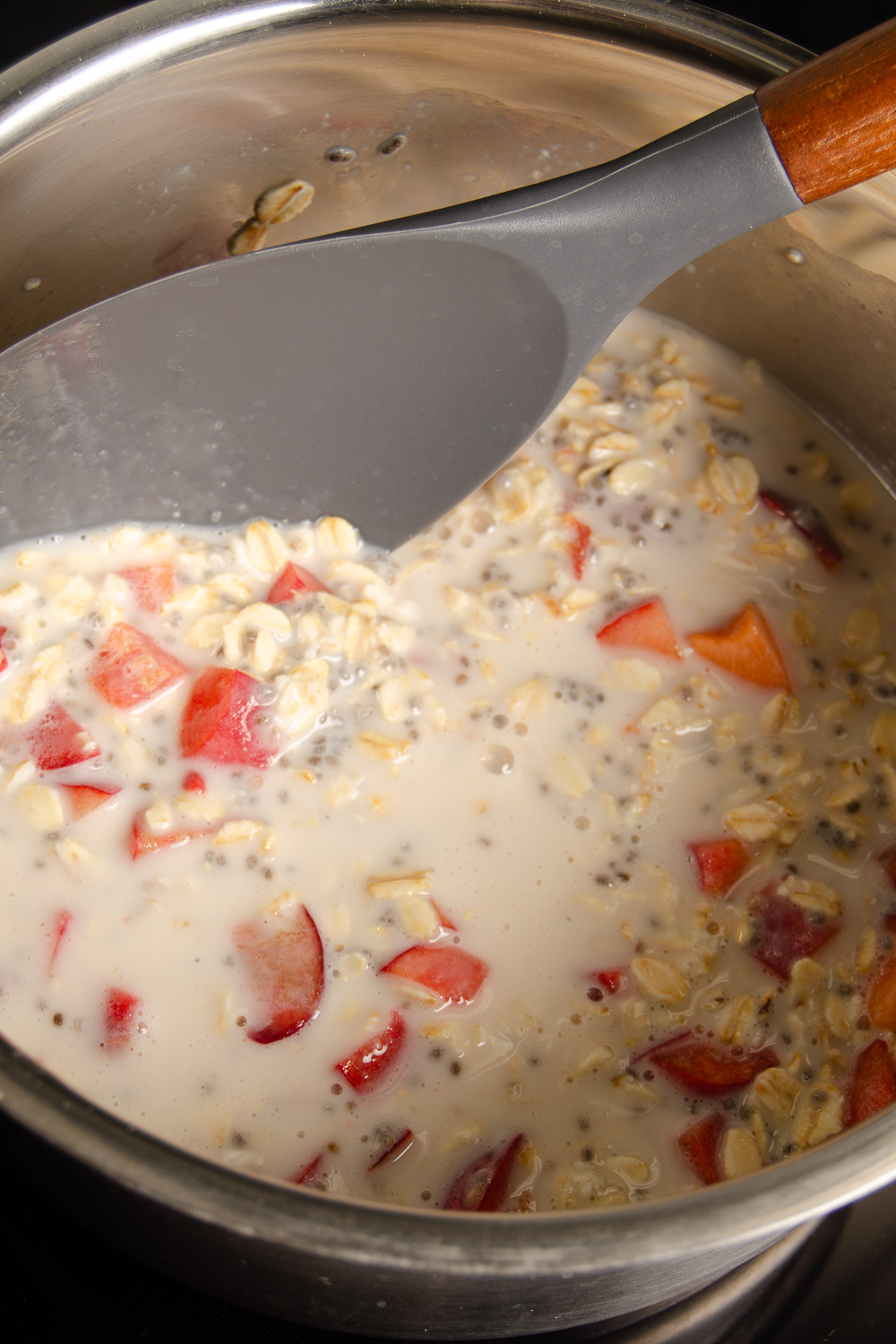 - Let the whole mix warm through without boiling for a few minutes. The oats will soak up more of the liquid and you will get a very luxurious texture.