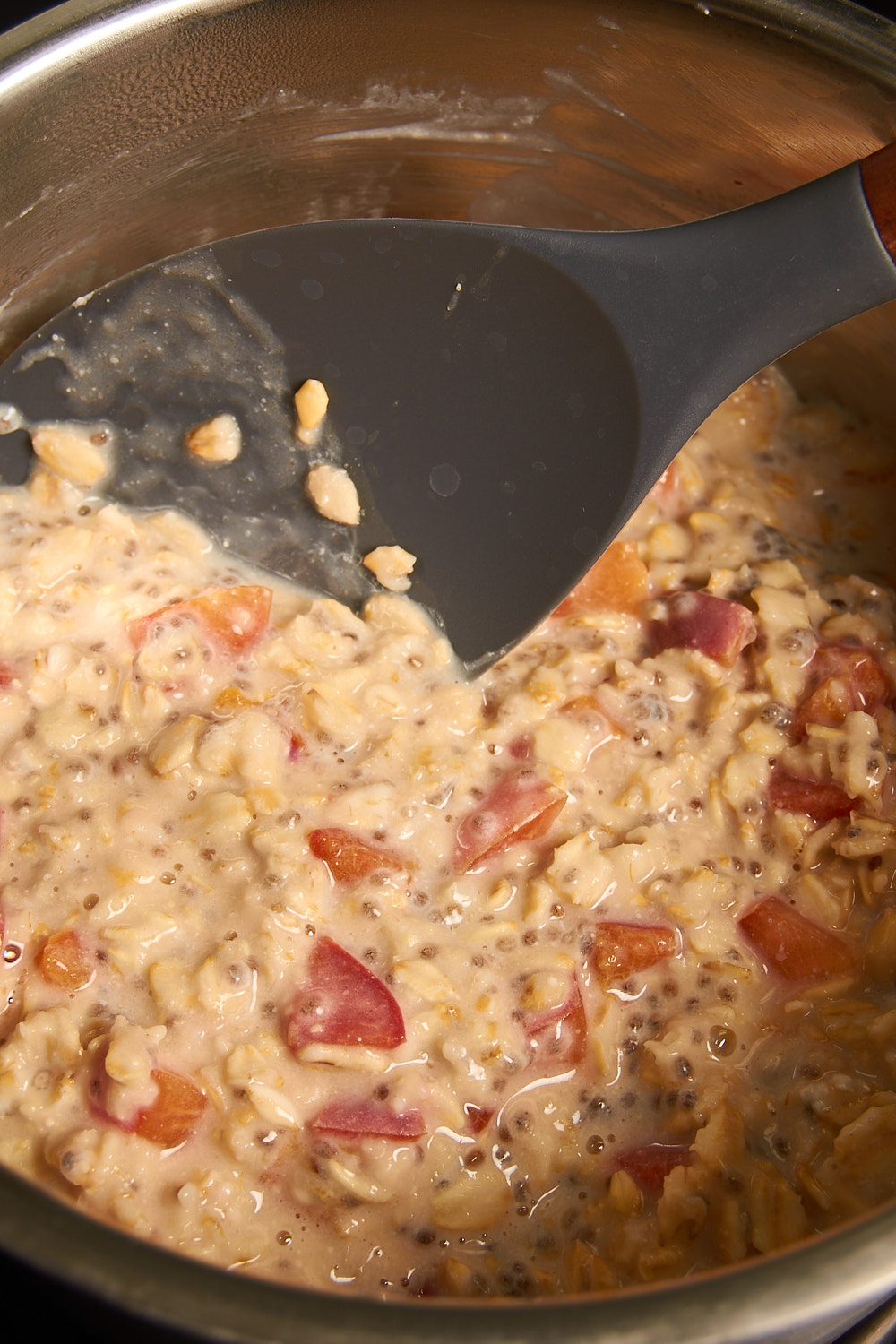 - Add the chopped dried or fresh apricots to the oatmeal and stir to combine. If you prefer your apricots with more bite or acidity, add them towards the end.