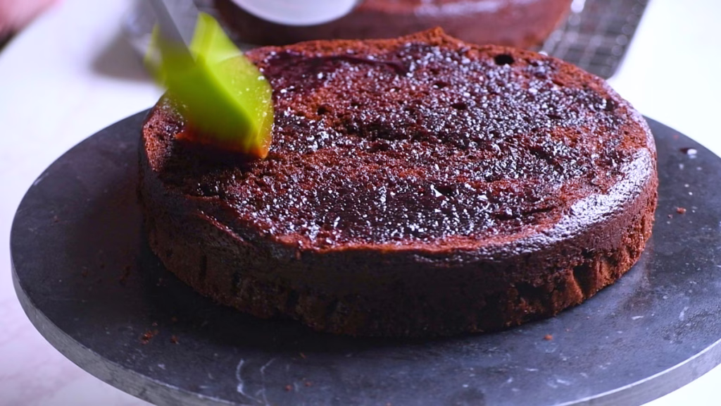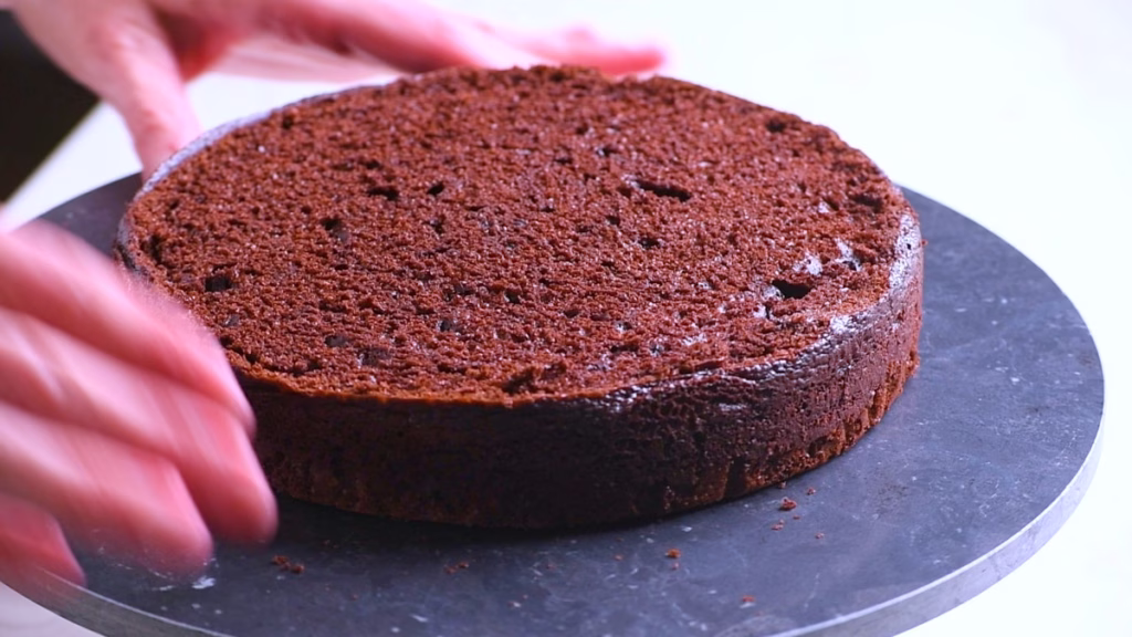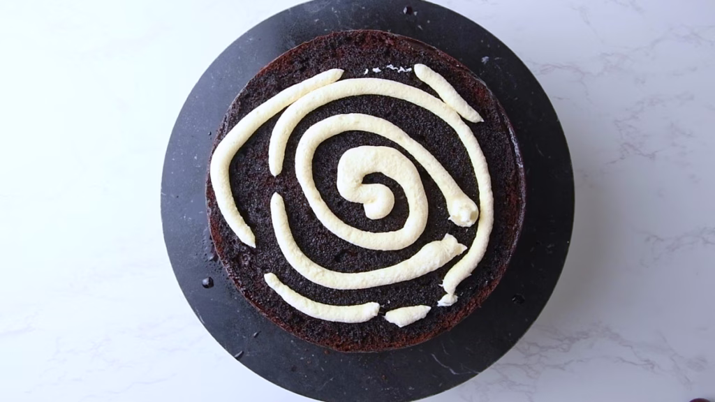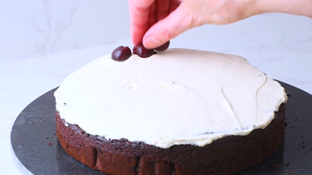 - Move the chosen bottom layer of your Black Forest sourdough cake onto a cake plater or rotating cake stand.