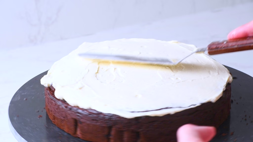 - Using your offset spatula, spread another third of the cream in a thin layer over and around the cake.