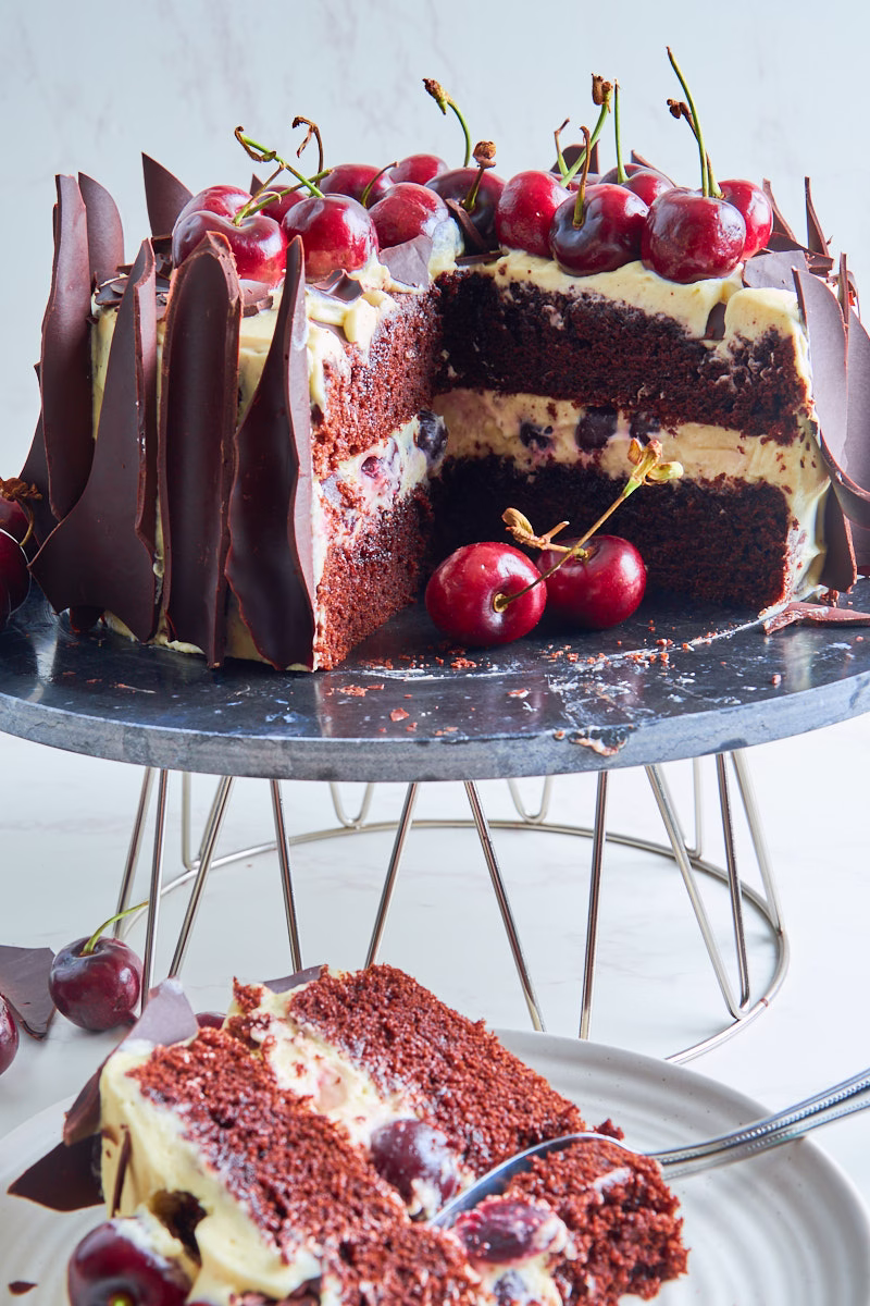The cherry syrup, cake layers and chocolate decoration can all be made the day before. Wrap the cake layers lightly in cling film, so they don’t dry out.