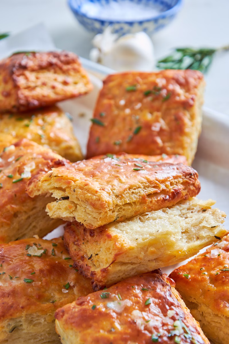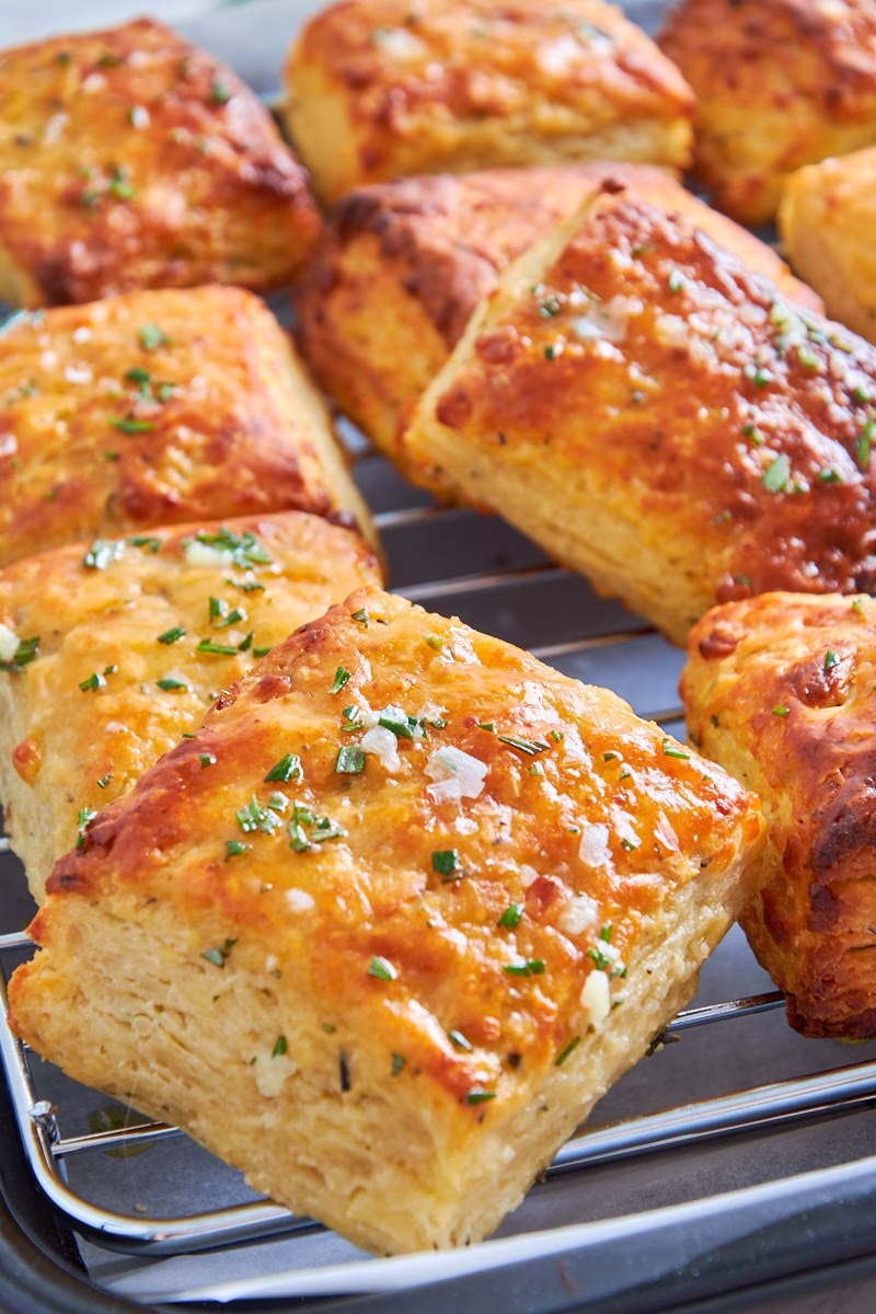 The first thing you’ll notice about these biscuits is (and should be) how incredibly cheesy, buttery and flaky they are. Baked golden brown, risen to perfection and with a lovely garlicky cheesy taste, they are exactly what you want from biscuits. Super tender Layers, separated by the flavored butter, in an easy lamination step that uses soft instead of cold butter, making the dough a joy to work with.