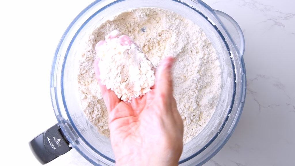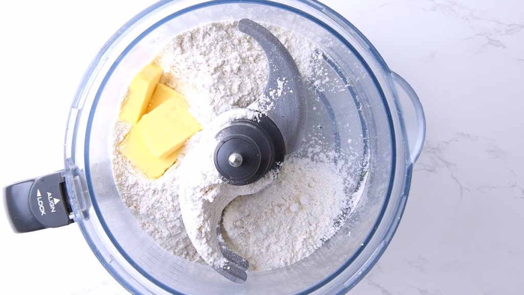 - Add the flour and cold butter for the dough to your food processor and just pulse a few times until you have about lentil sized bits of butter in the flour.