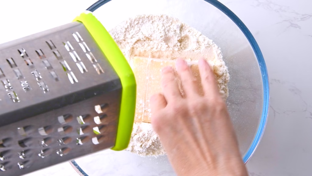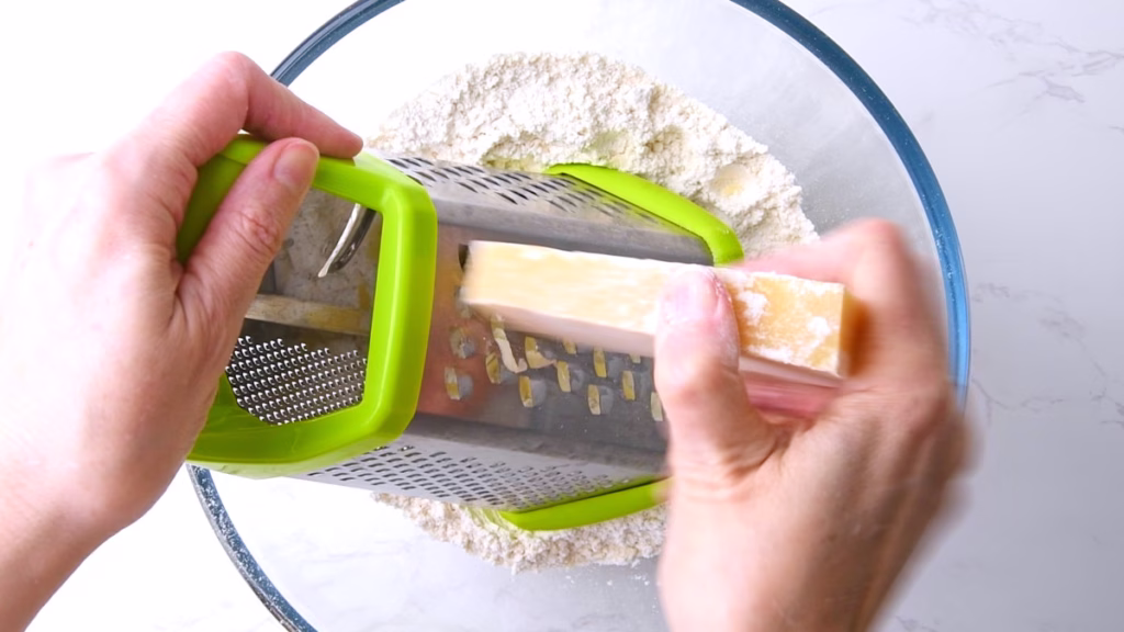 - Using the coarse side of your box grater, grate your chosen cheese into your flour. I saw Claire dipping her chunk of cheese into the flour, which is usually done by pastry chefs to keep grated butter bits separated, but I found it super helpful for getting a better grip on the block!