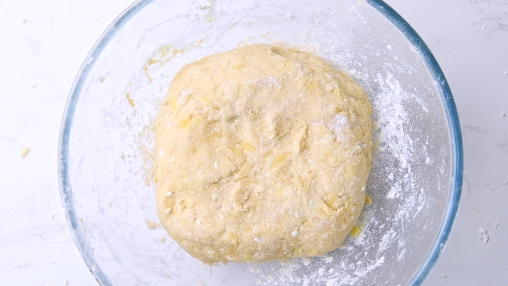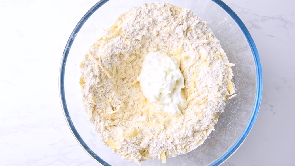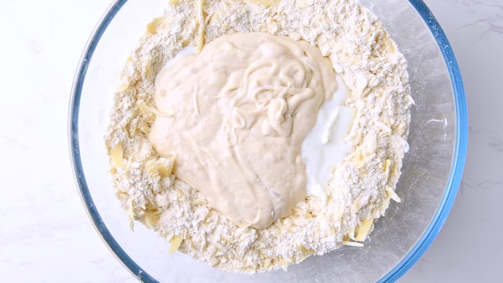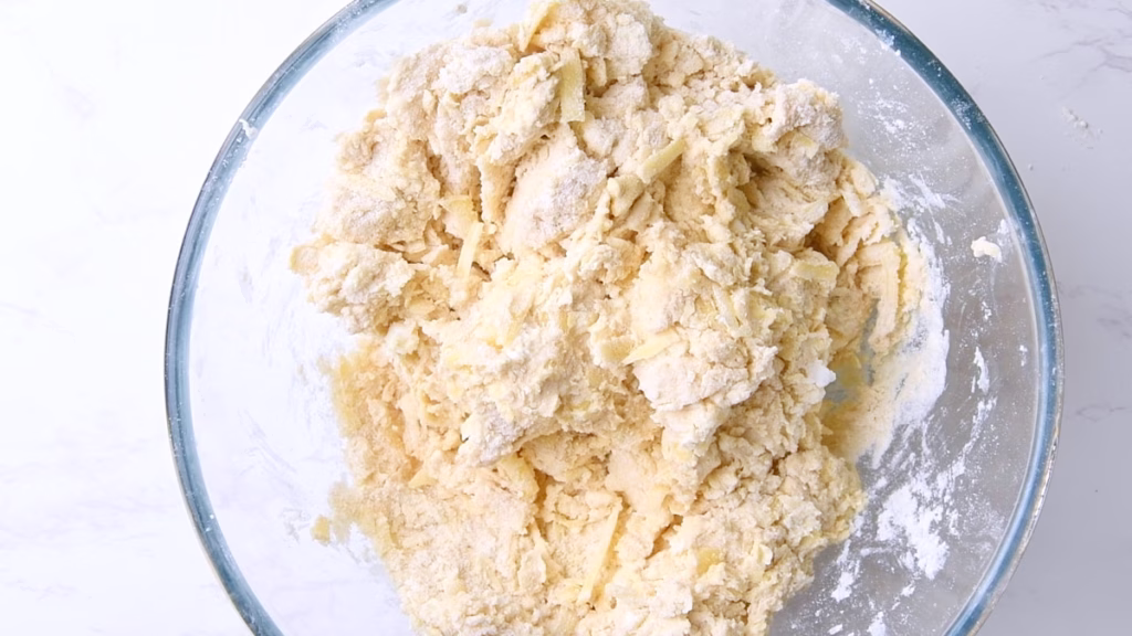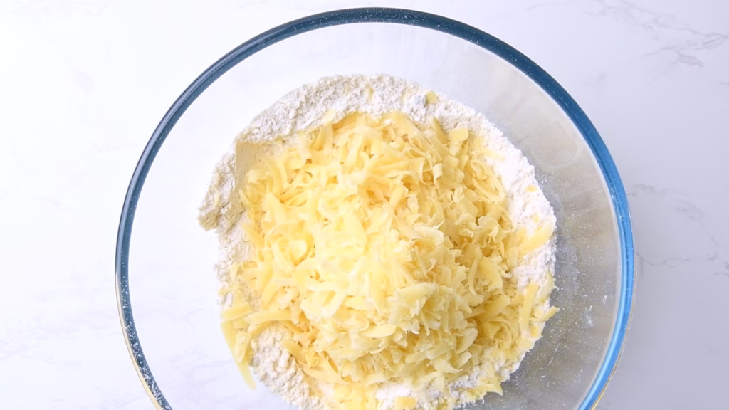 - Briefly mix the grated cheese into the flour, so it’s all coated. This prevents big chunks from forming and gives you an even distribution of cheesy flavor.
