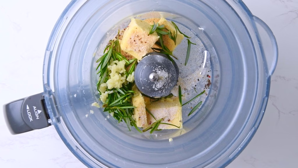 - If you are using a food processor, simply add all the laminating butter ingredients (roughly chopped garlic and rosemary needles removed from the stems) to it and pulse until you have a uniformly mixed butter.