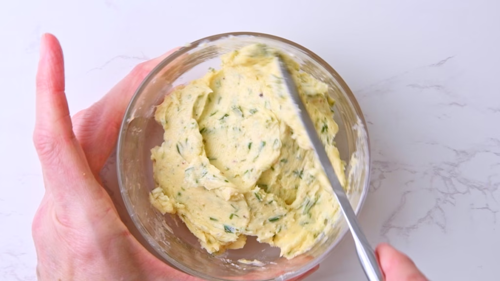 - If mixing by hand, finely chop the fresh rosemary. Grate or press your garlic clove into the butter for laminating. Add chopped rosemary and seasonings and mash with a fork until combined and soft.
