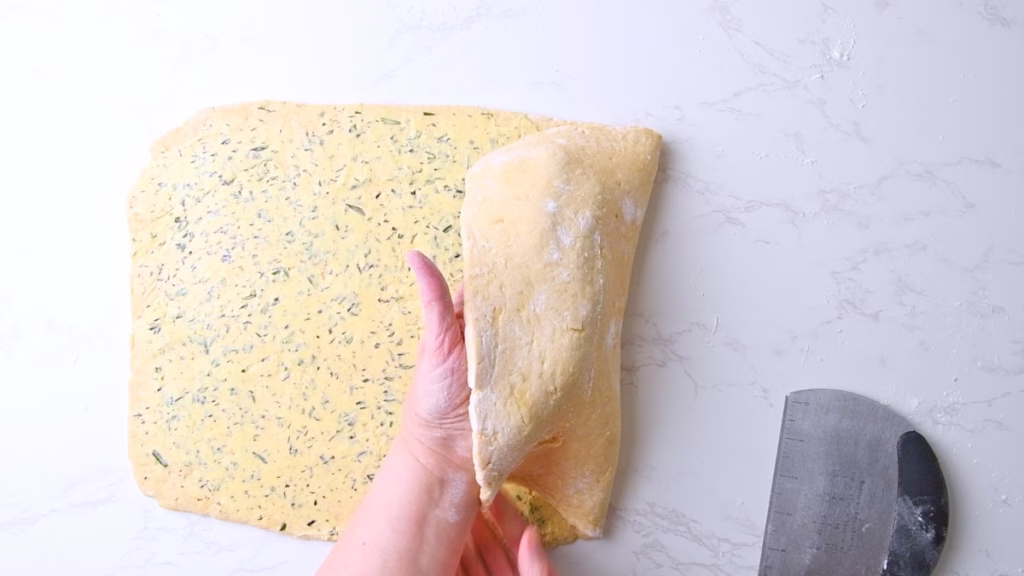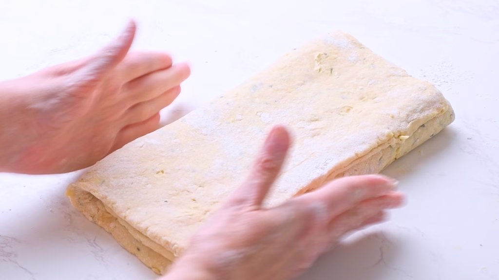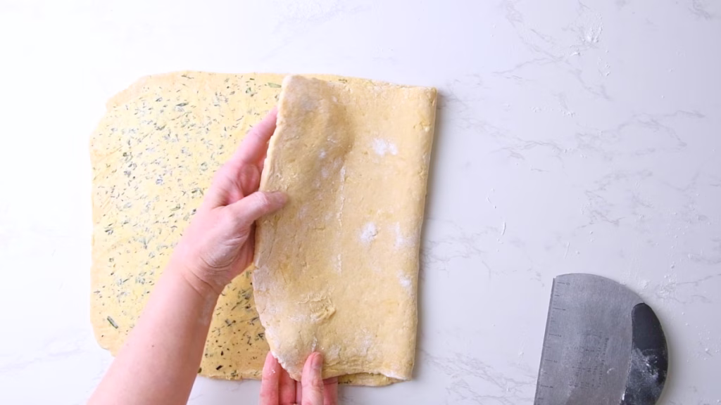 - Now fold the top third over the middle third, covering the butter, then the bottom third over the folded part, creating a sort of envelope shape with butter between each layer. Try to gently tug the corners, so they fit neatly on top of each other. It doesn’t have to be perfect. This will create the buttery flavored layers in the biscuits.