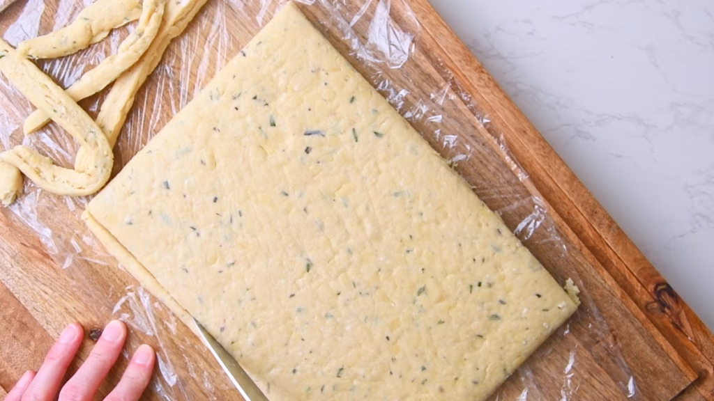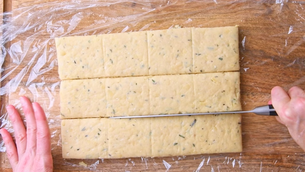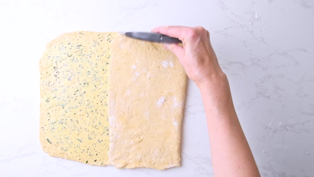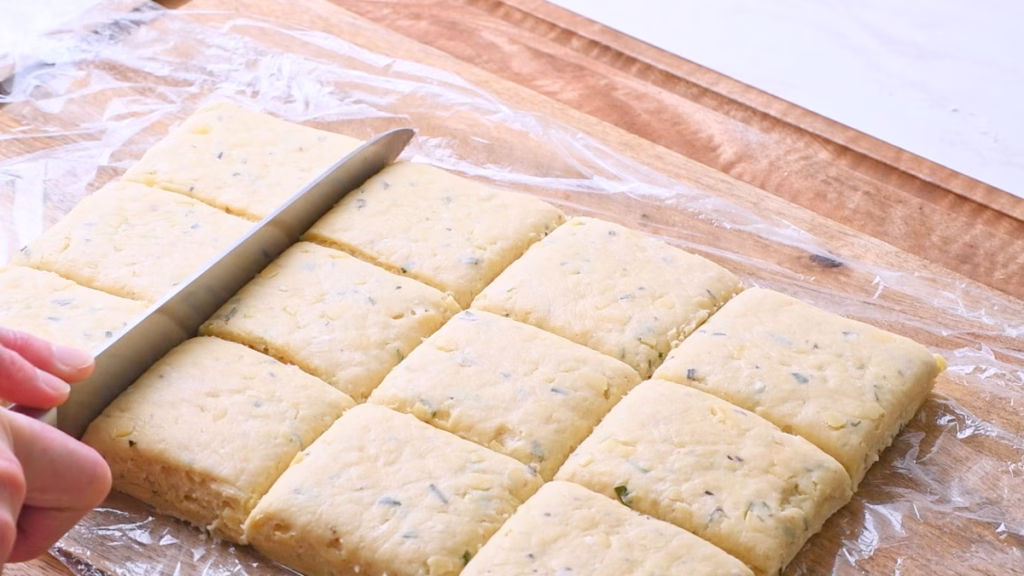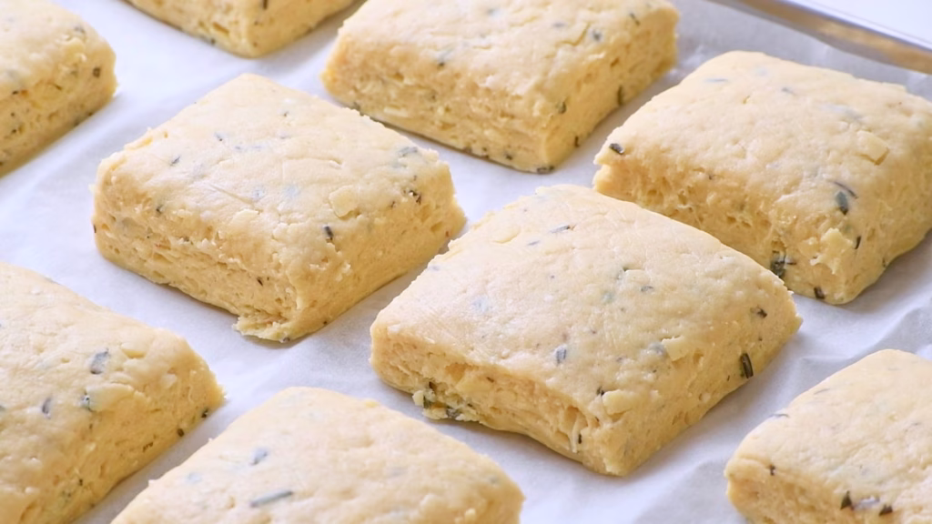 - Once the dough had it’s fridge time, you can cut your biscuits. While you can of course cut round ones if you like, I feel rectangles lead to better results, as you don’t have to re-roll scraps of dough and get the optimal flakiness in every single piece.