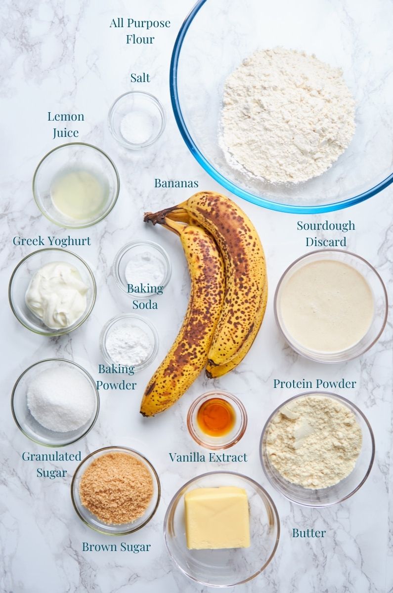 - Sourdough Discard – Made up from flour and water, this contributes the other half of moisture and a bit of structure. But its main purpose is balancing the sweetness from the bananas, protein powder, and cinnamon sugar with its gentle tang.