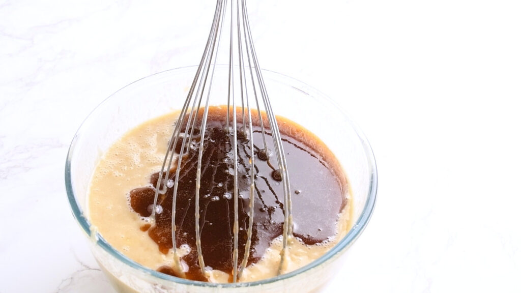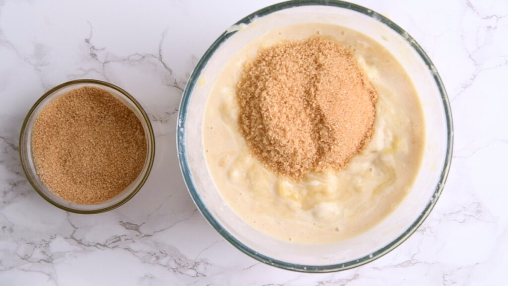 - Add the two sugars (reserve the sugar for the topping for later) and protein powder. Whisk until no lumps remain.