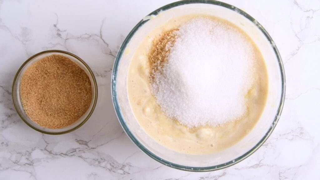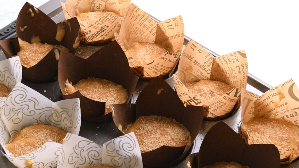 - Brown and White sugar – I love the combination here, as the brown sugar adds even more caramel flavor and helps with moisture retention more than its white counterpart, while the white one keeps the muffins fluffier with a finer crumb structure.