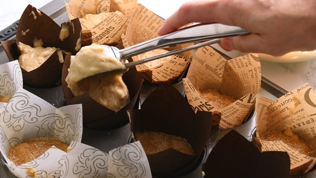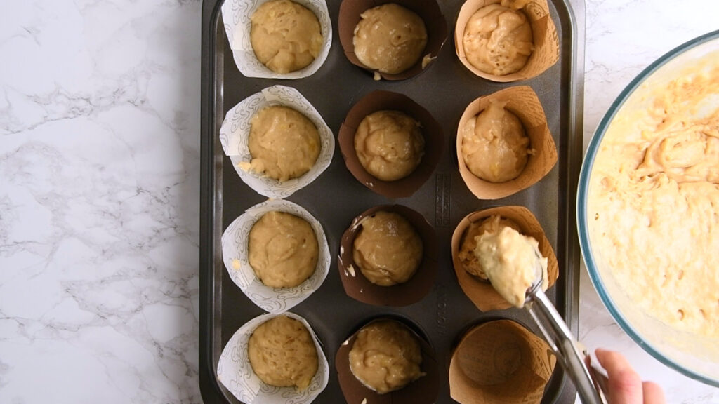 - Using a medium cookie scoop or a tablespoon, fill each muffin case halfway.