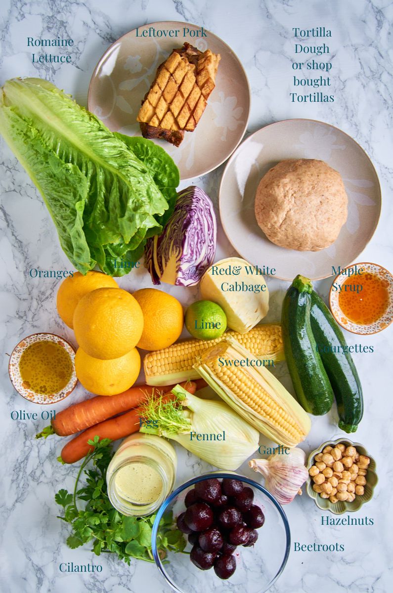 Lots of crunchy nutritious veggies, some made into a slaw, charred corn and marinated, fried zucchini, quick marinated beets, orange slices and crunchy hazelnuts make this Cuban Pulled Pork Salad a super healthy feast in its own right. I’m using part of the Slow Roasted Cuban Pork Shoulder from the day before, as a fantastic way to use up leftovers and speed up your meal prep. The Salad is brought together by a zingy Cuban inspired Orange Maple Vinaigrette with Hazelnuts and Lime, using similar ingredients to the pulled pork marinade, to complement the flavours.