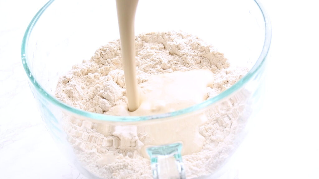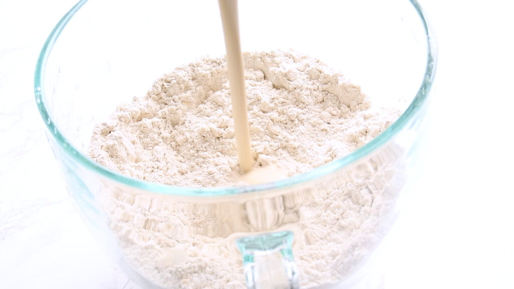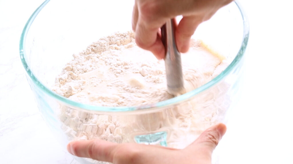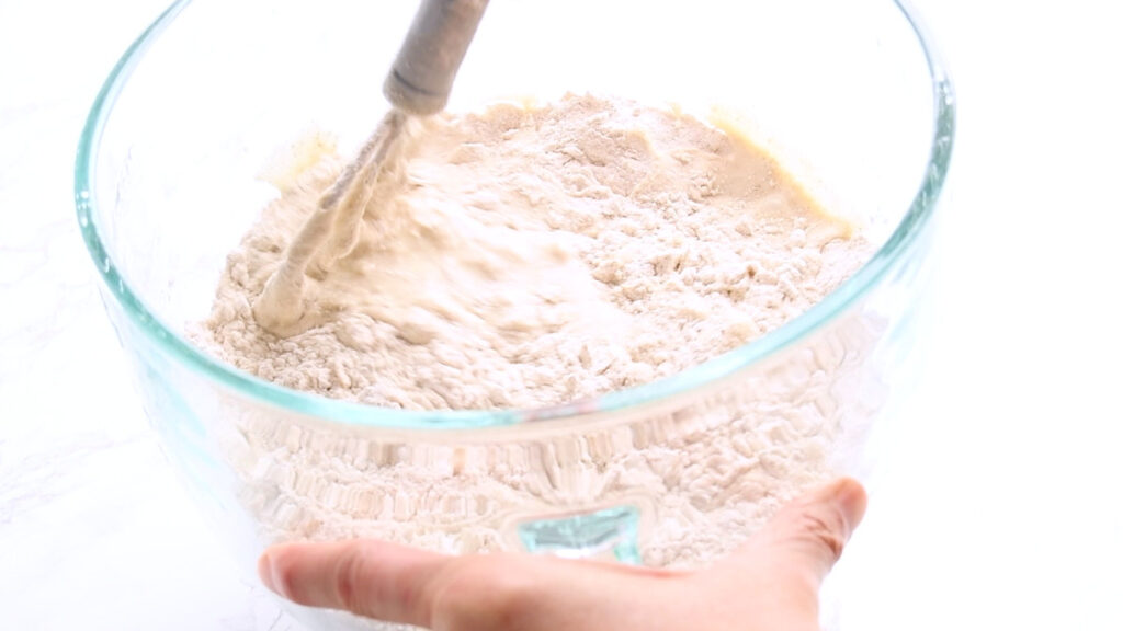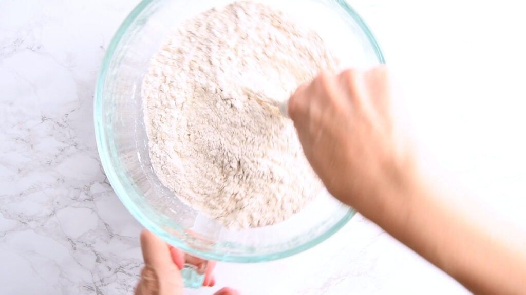In a large bowl stir together both of the flours and salt. I’m using kosher salt, which has a higher volume per gram, so for me this is 2 tsp. If you are using sea salt, use 1 tsp.