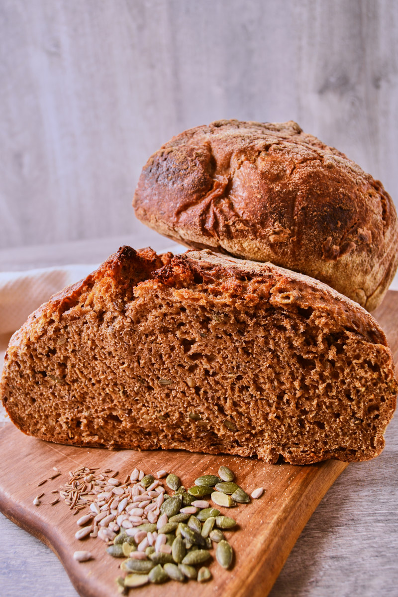 This recipe makes one large loaf of beautifully crusty, malty, and moist sourdough rye mix bread, similar to what you find in German bakeries, which goes well with anything from cheese over charcuterie to even sweet toppings, as it cuts through them with its slightly sour flavour.
