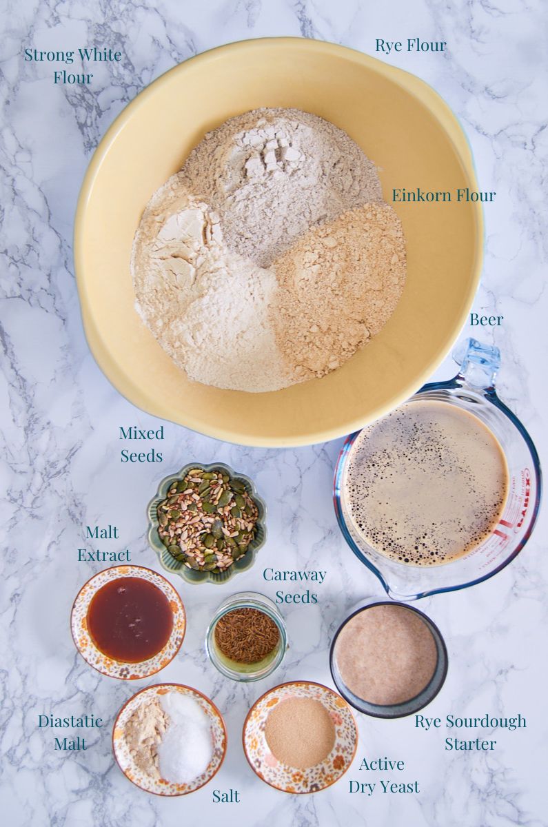 In a jug large enough to fit about 1.5l (1.5 quart) mix sourdough starter, beer, water, yeast if using, diastatic malt and malt extract.