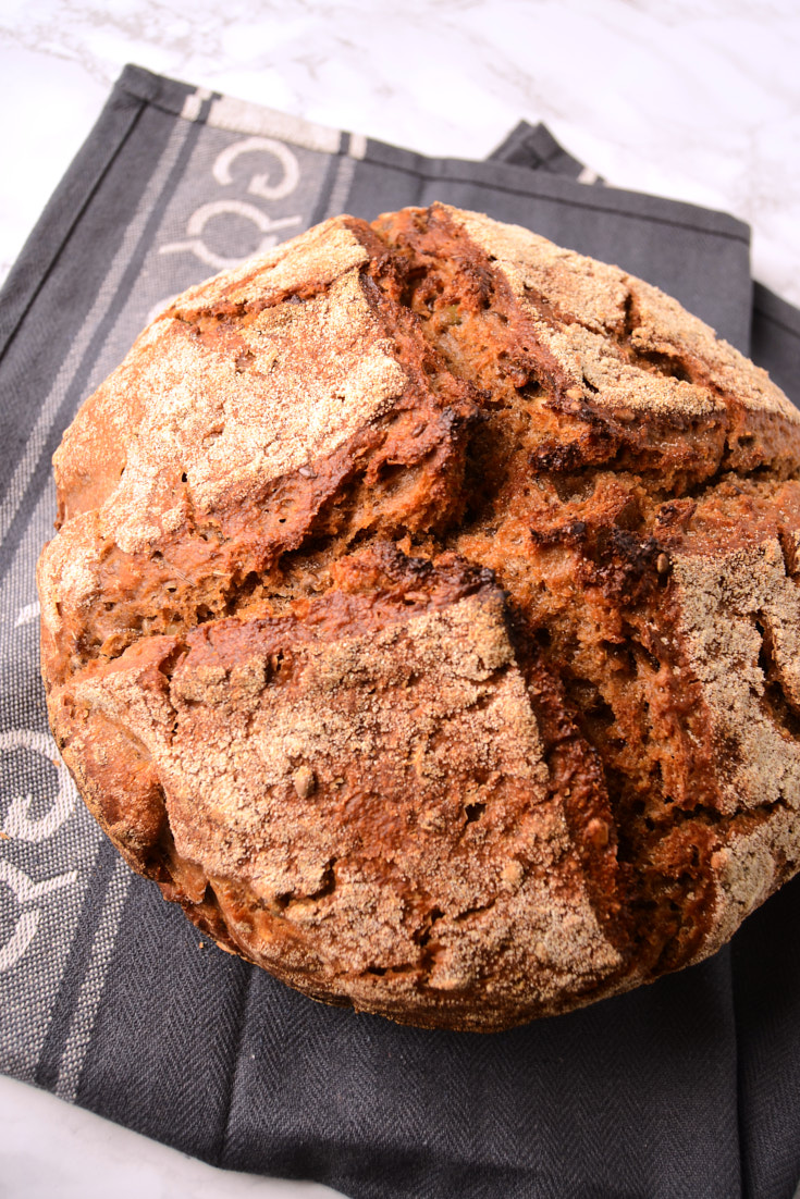 This recipe makes one large loaf of beautifully crusty, malty, and moist German Sourdough Rye Beer Dutch Oven Bread, similar to what you find in German bakeries, which goes well with anything from cheese over charcuterie to even sweet toppings, as it cuts through them with its slightly tangy flavour. And the best thing: It’s no knead and apart from mixing the ingredients together quickly basically makes itself.