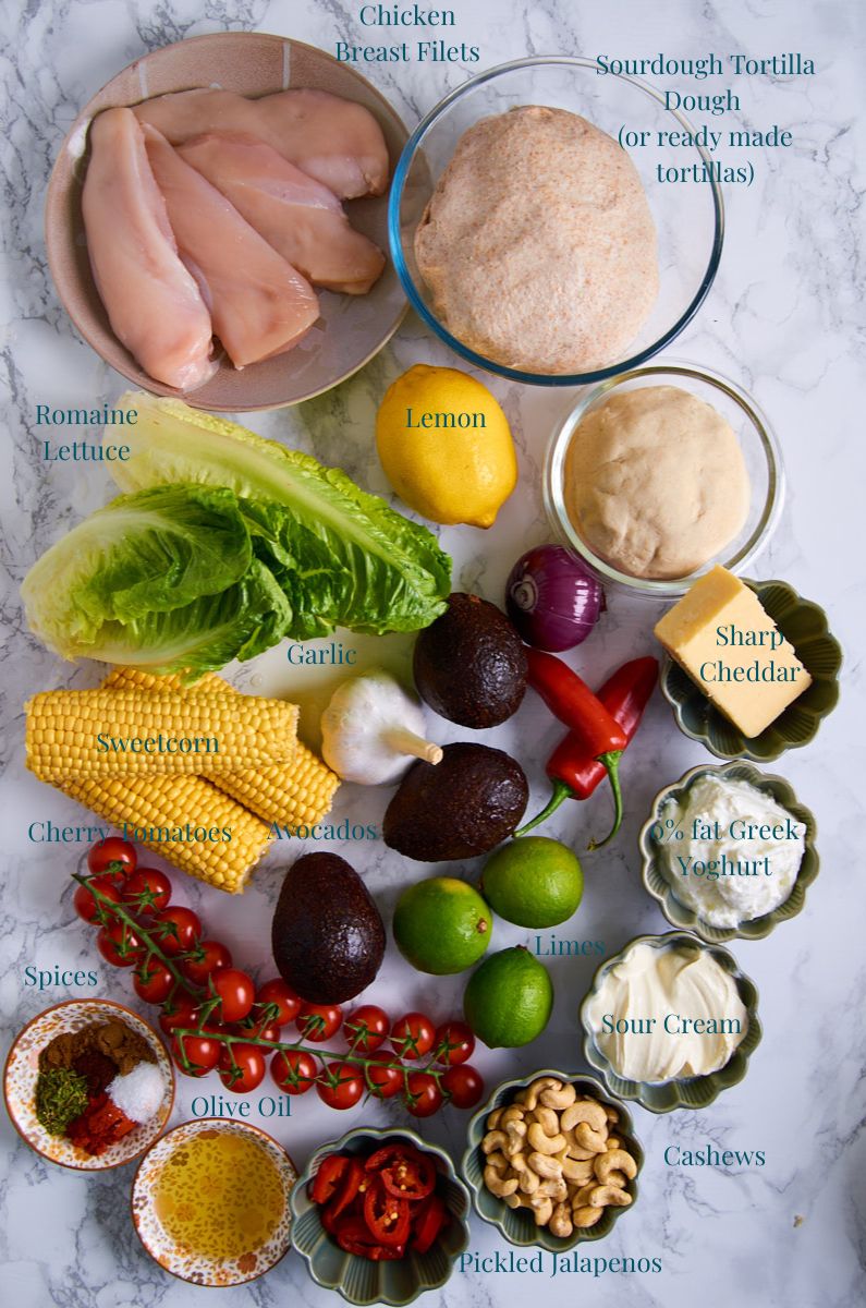This is my version if Healthy Chicken Tacos: Smoky seasoned chicken breast, fried with cashews for extra crunch. On generous wholewheat wrap smothered with creamy guacamole. Topped with layers of crunchy lettuce, fresh, charred sweetcorn, homemade zingy salsa, and vibrant spring onions. Finished with a sour cream-yoghurt-lime drizzle and grated cheddar. This is the dinner of my dreams.