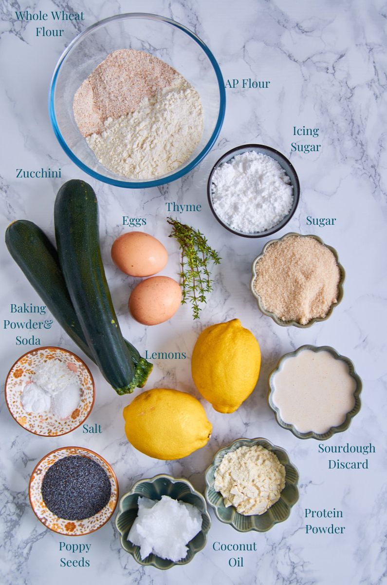 • Not to forget the lemon. We are making Lemon Poppy Sourdough Zucchini Bread with Protein after all. The zest of a whole lemon goes into the batter, plus 3 tbsp juice. Then we use more juice to mix with icing sugar later for the glaze.