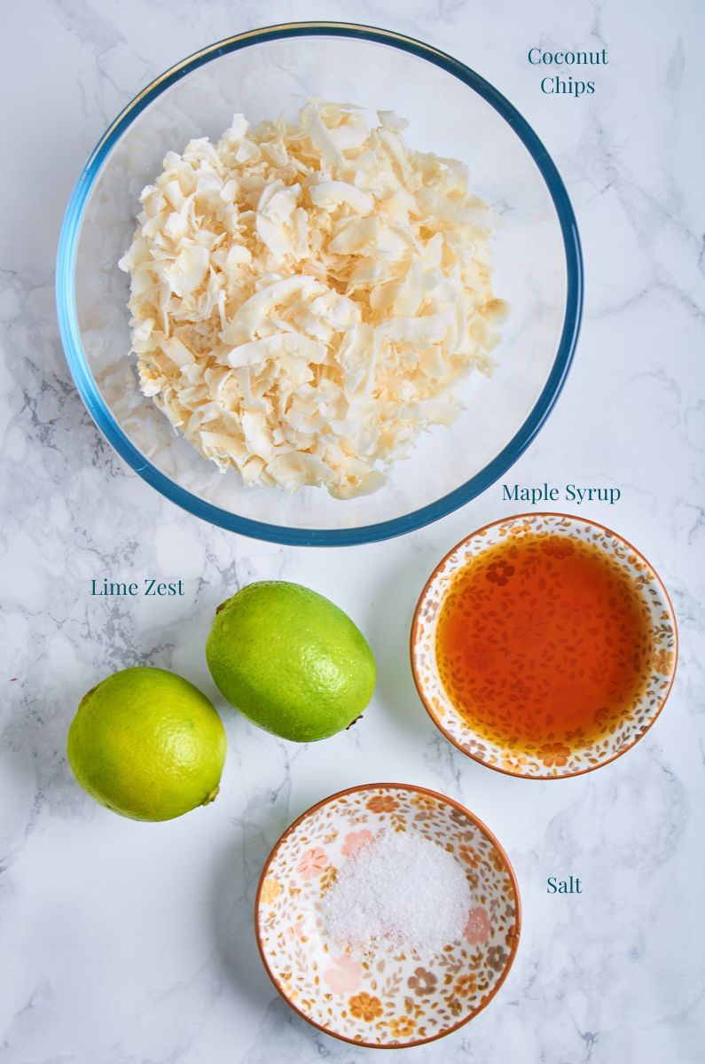 - In a bowl, combine the coconut chips, maple syrup, lime zest, and a pinch of salt. Mix well.