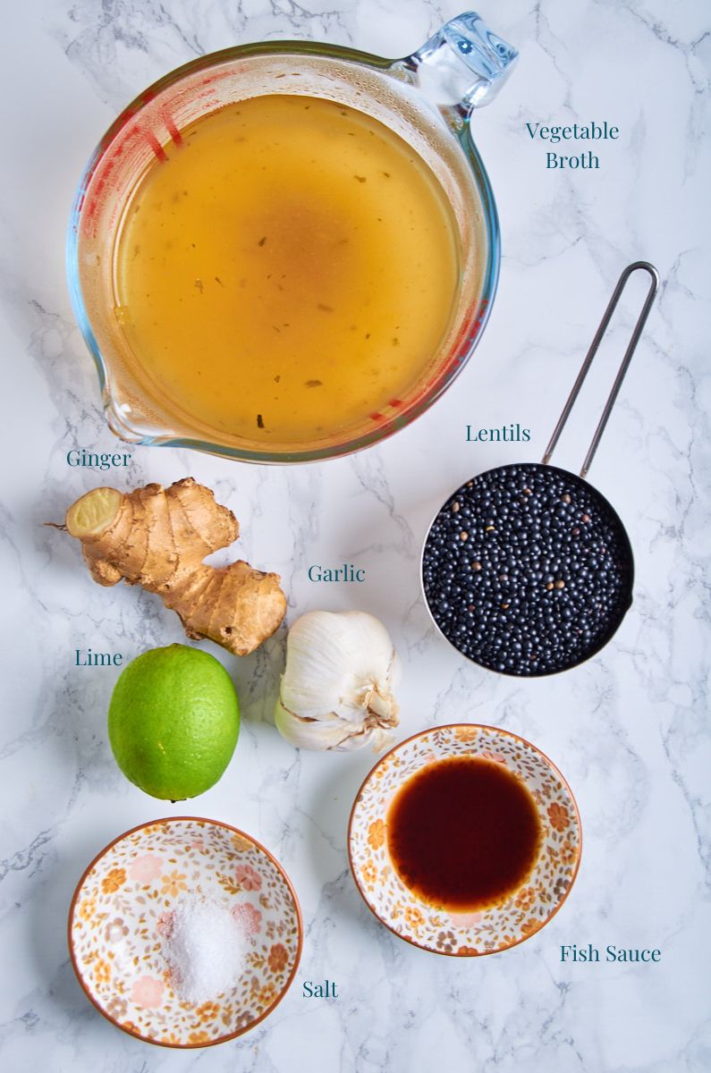 The Lentils are cooked in broth and then seasoned with coconut, lime and a bit of fish sauce and chili sauce (if you like).