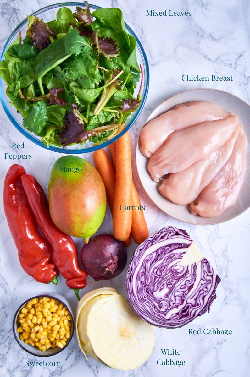 - In a large bowl, mix together the shredded red and white cabbage, shredded carrots, thinly sliced red onion, and sweetcorn. Add half of the remaining dressing and refrigerate to allow the flavours to meld. Gently fold in the sliced mango.