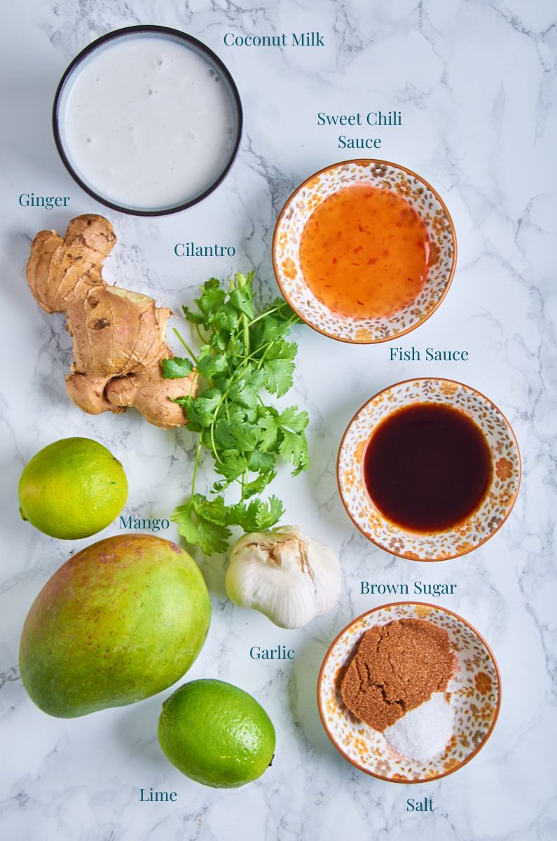 - In a blender or food processor, combine 1 cup of coconut milk, 1 cup of chopped mango, the zest of 2 limes, juice of 2-4 limes (adjust to taste), fish sauce, sweet chili sauce, smashed garlic cloves, half of the grated ginger, brown sugar, and 1.5 teaspoons of kosher salt (or adjust to taste). If desired, add cilantro. Blend until smooth.