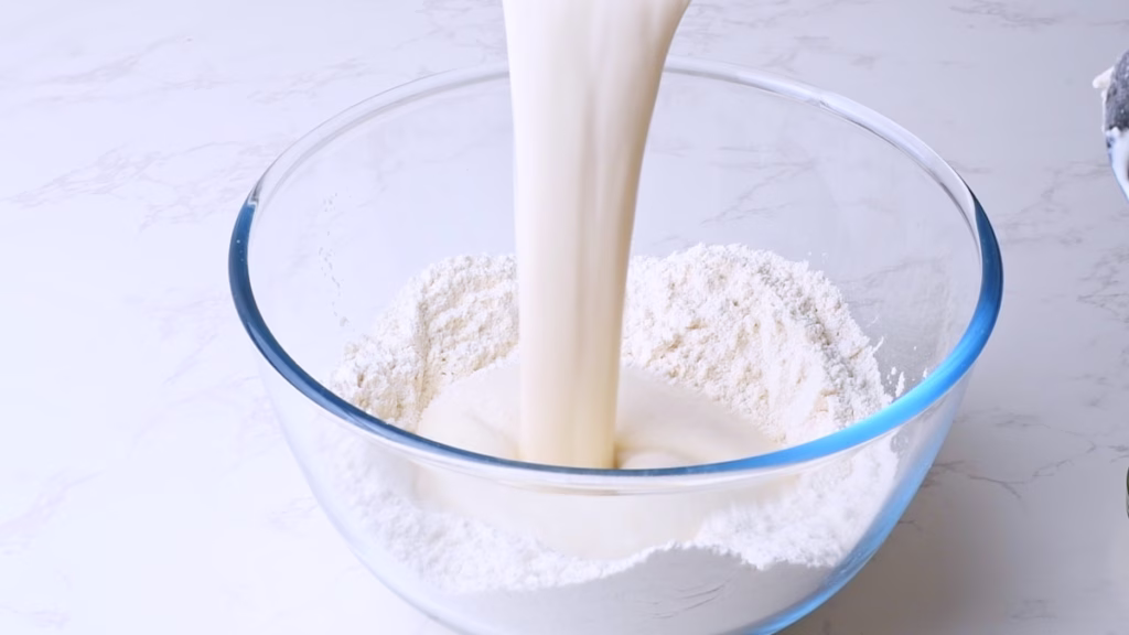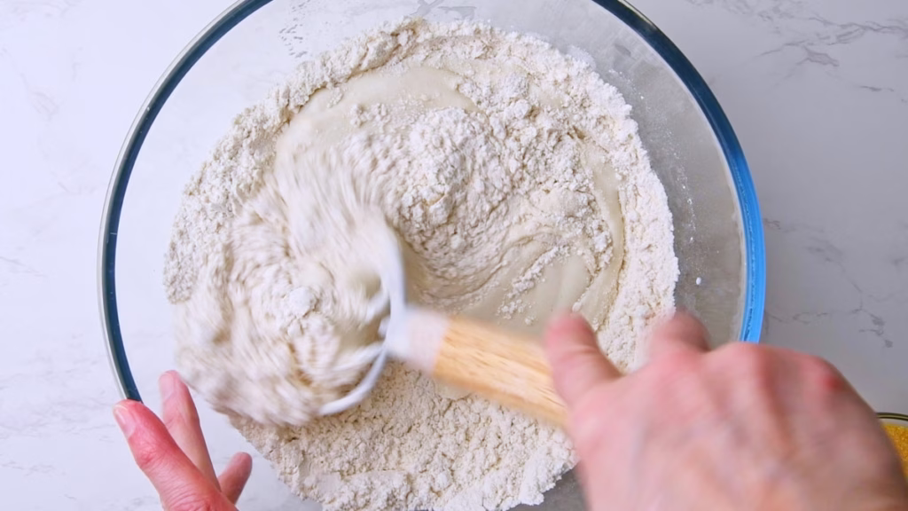 - Pour the liquids into your flour and stir until you have a shaggy dough without any dry flour bits.