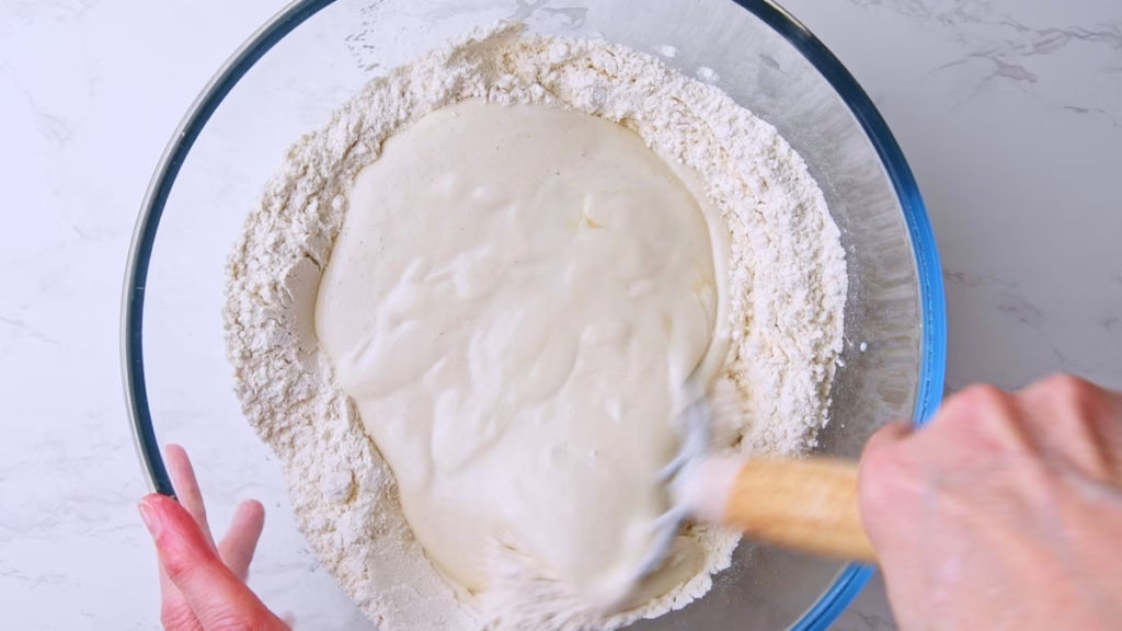 - Add the cottage cheese-protein mix to the sourdough starter and stir until combined.