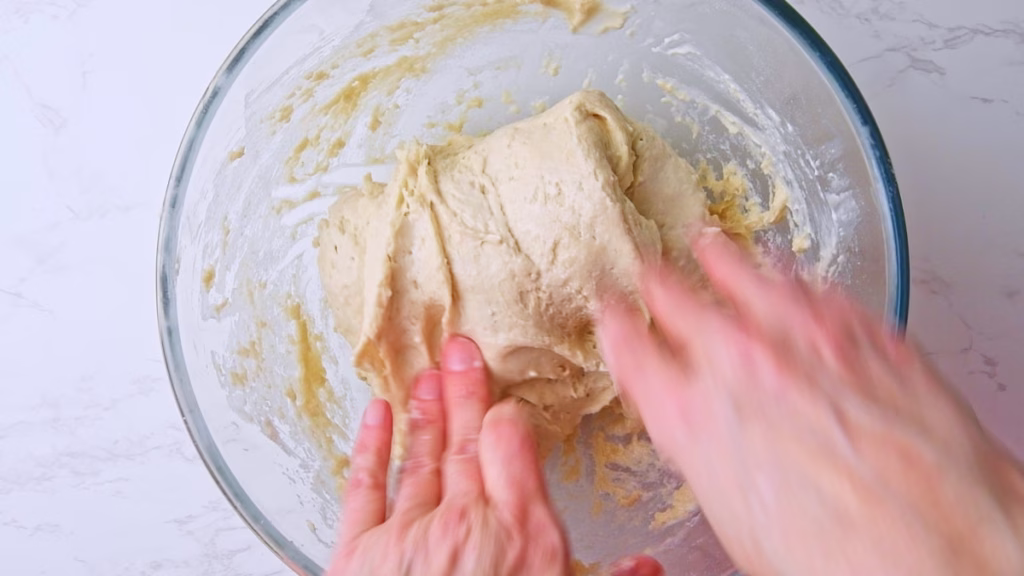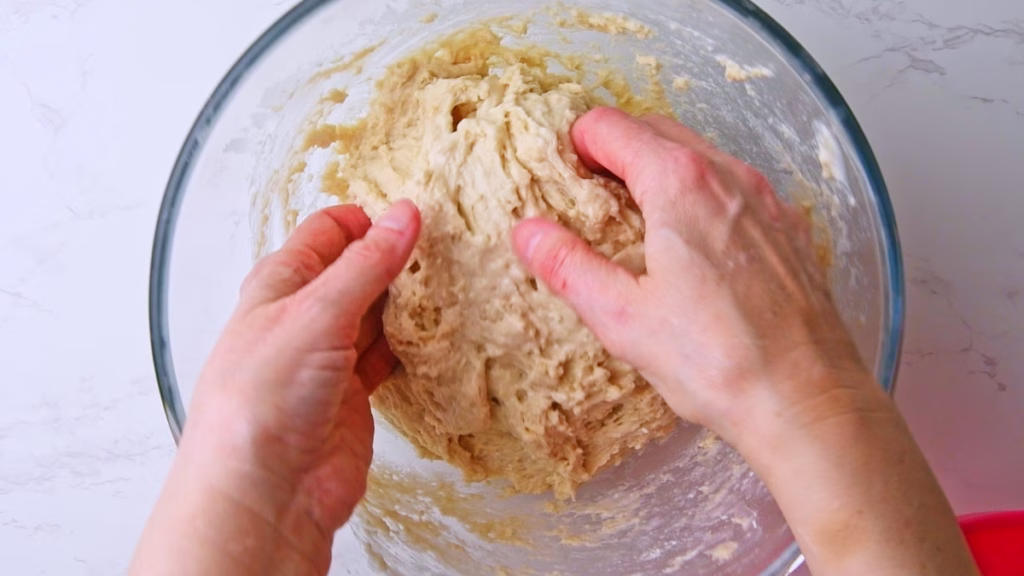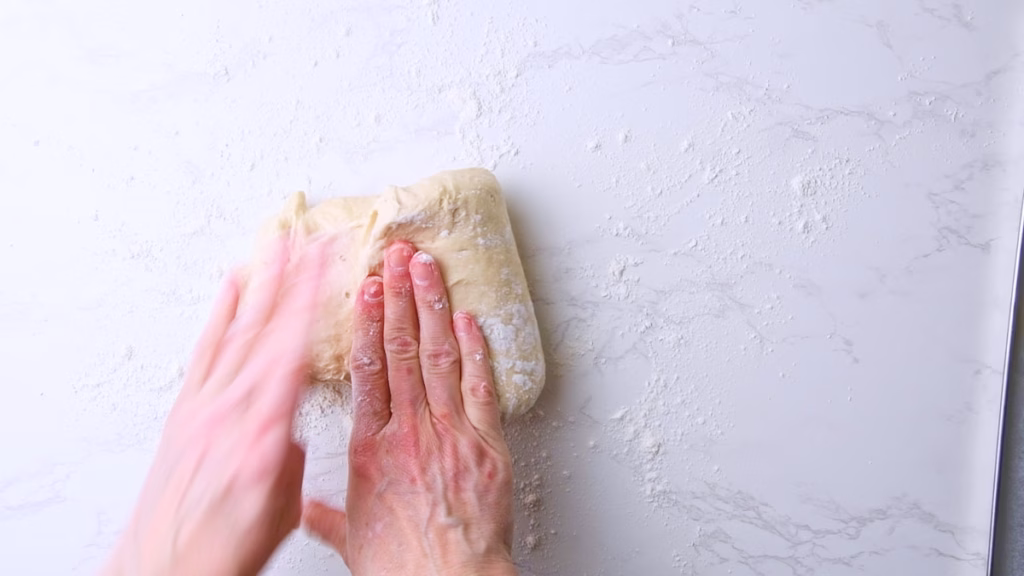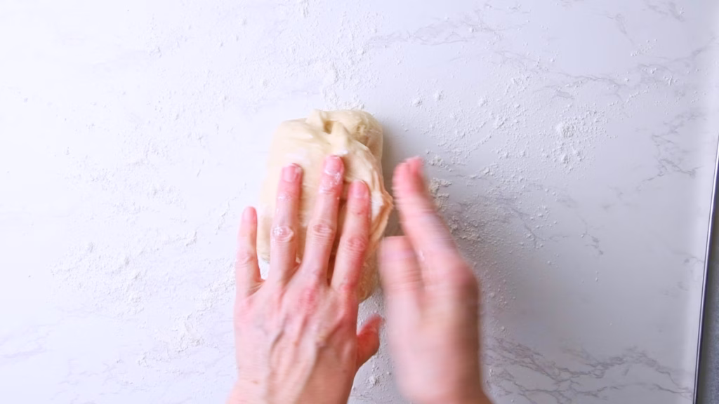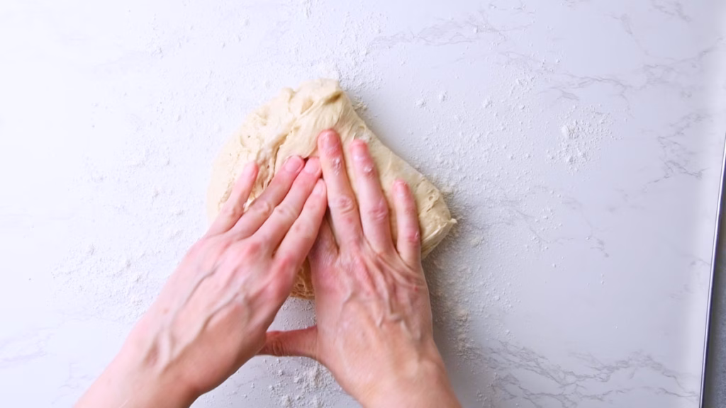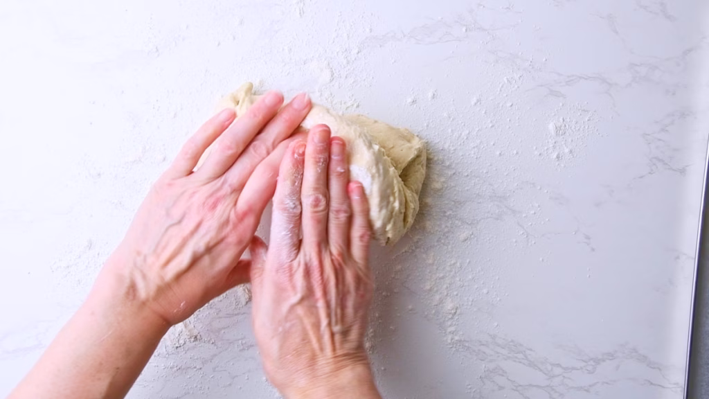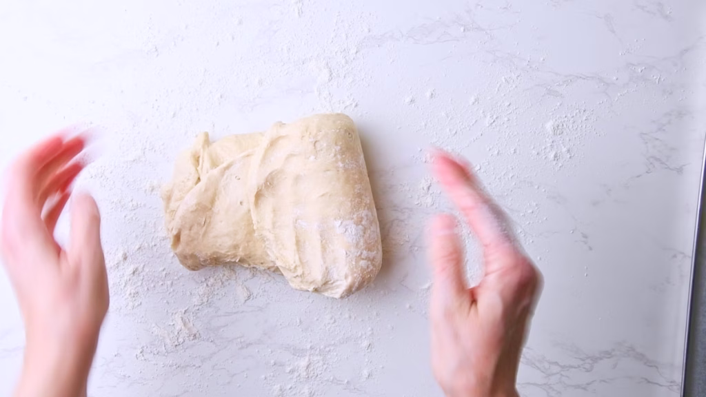 - Push both hands under the dough, pulling it upwards. Then fold it over itself.
