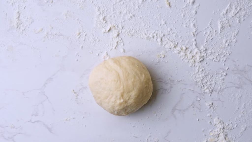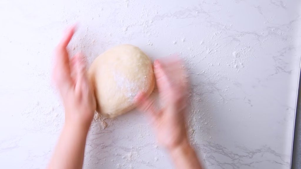 - Turn it seam side down on your hand or work surface (very little to no flour, so it can get traction), cup your other hand over it and start rotating in small circles until you have a neat ball and the seam at the bottom is mostly closed.