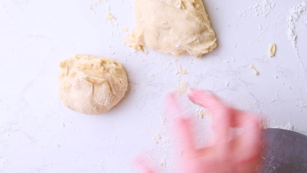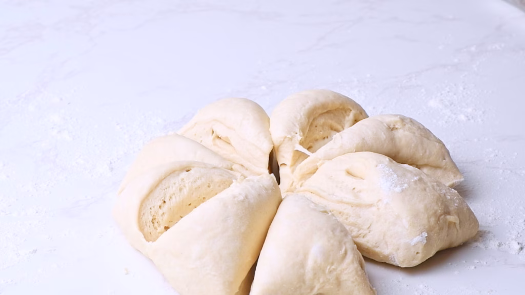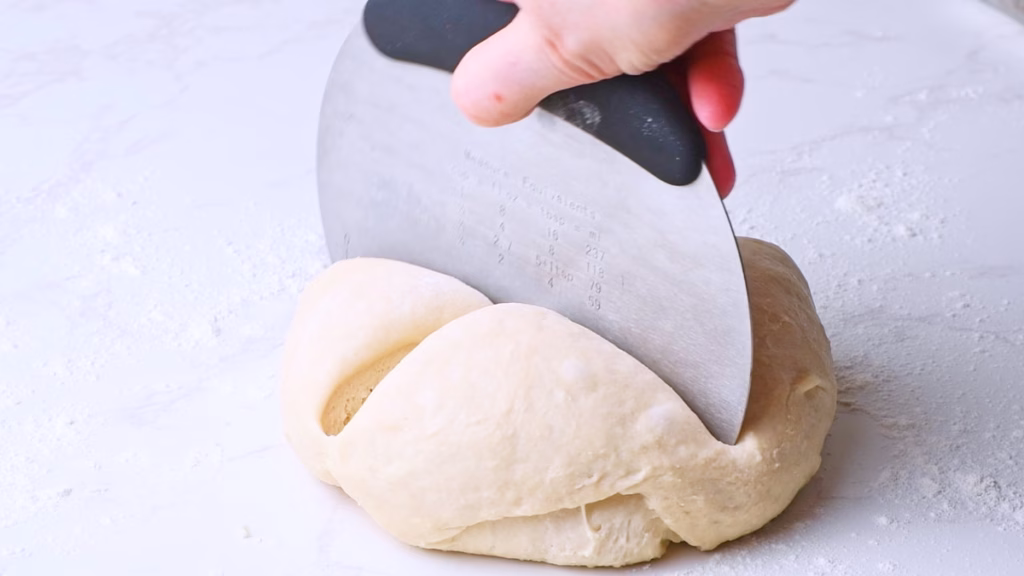 - Use your dough scraper or knife to cut it in half, then quarters, then eight pieces.