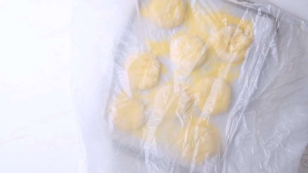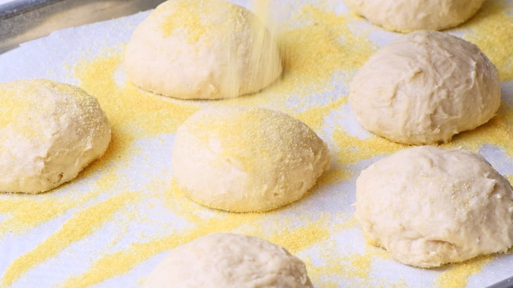 - Sprinkle the tops with the remaining cornmeal and gently flatten them a bit with your palm.