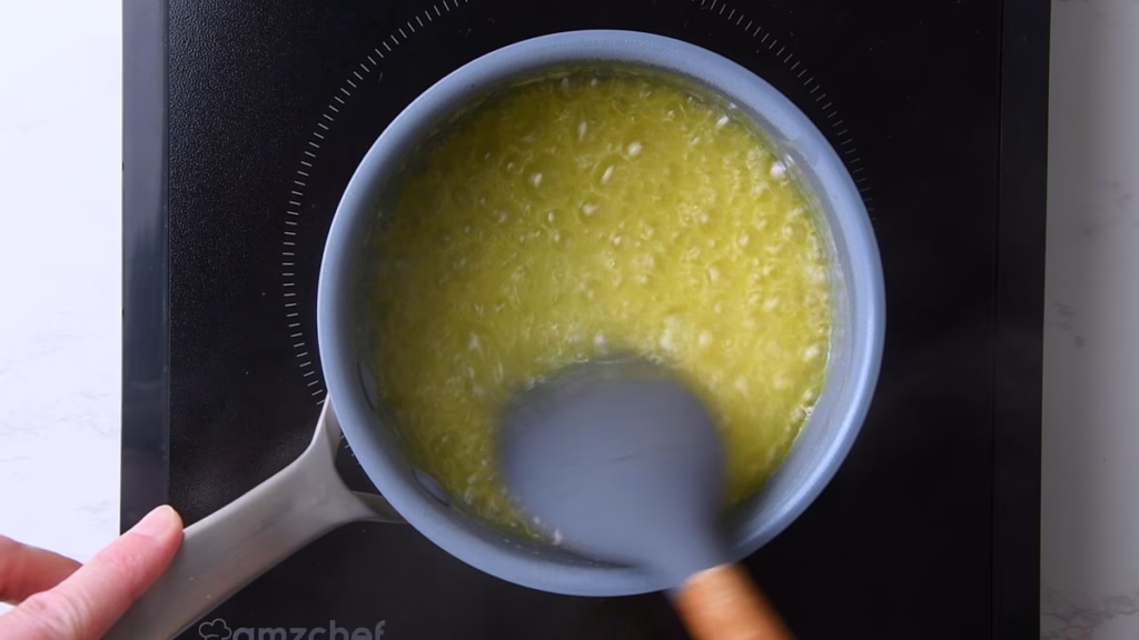 - In a saucepan, melt your butter over medium high heat. It will splatter and bubble wildly.