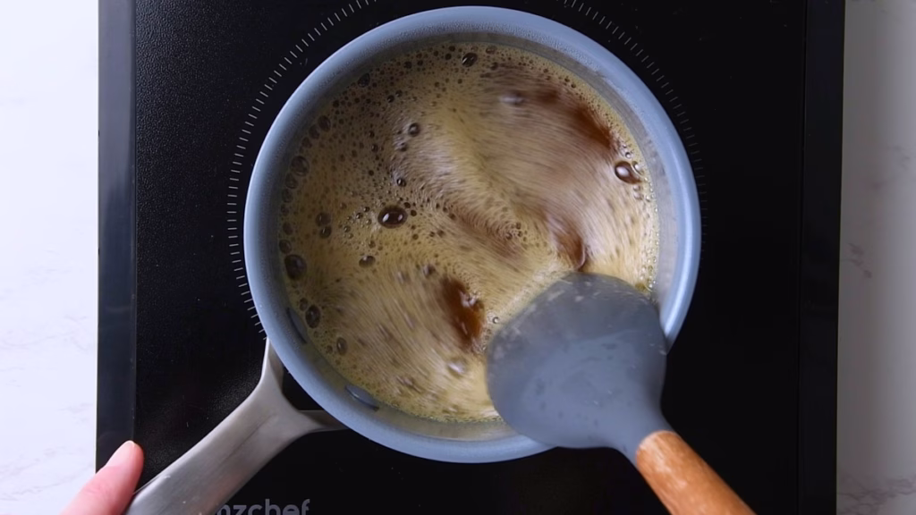 - The moment you hear the sound changing and the bubbles look smaller, turn down the heat to medium low and start stirring with your spatula, scraping any brown bits off the bottom of the pan. This is the good stuff, you don’t want it to burn!