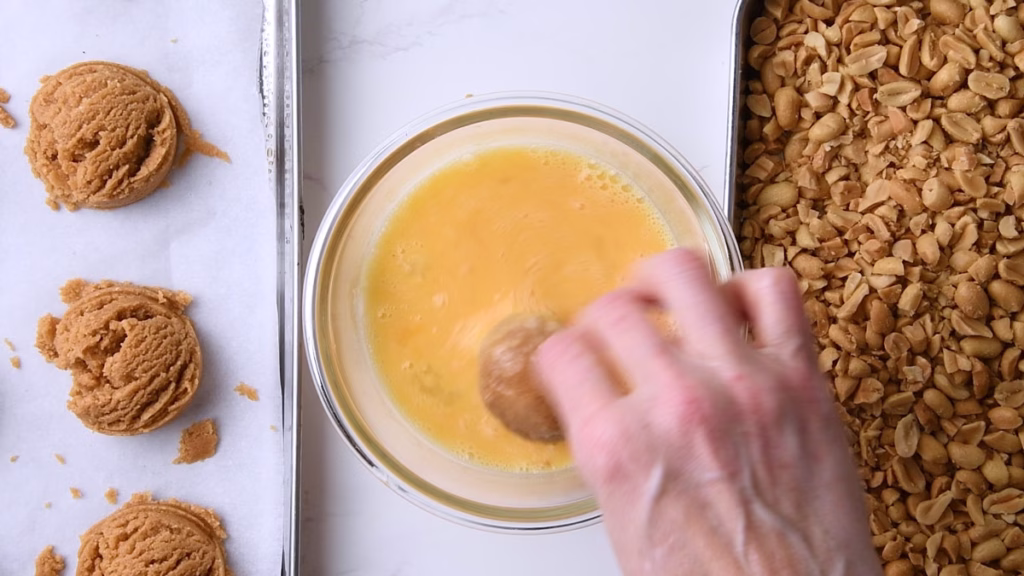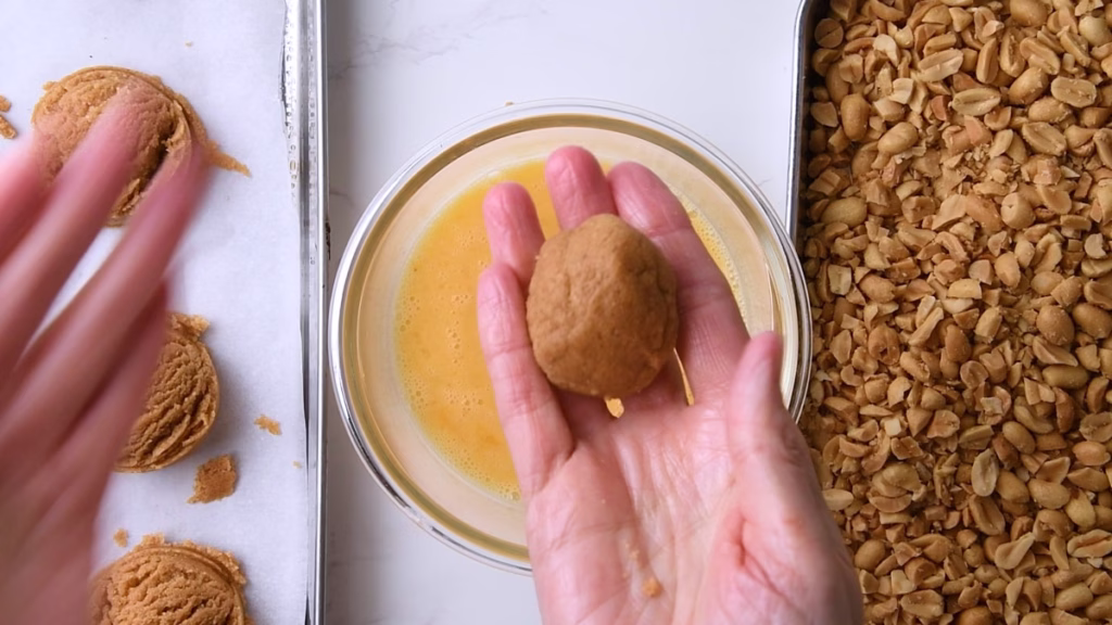 - Toss each of the dough balls in the egg wash, then right into the peanuts, pressing them onto the dough firmly. Again, play with the pressure point here. My first cookie crumbled a bit when pushing too firmly but easily came back together.