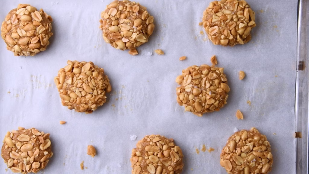 The whole, roughly chopped peanuts covering them make them taste very similar to Payday bars including a soft, brown butter infused center tasting intensely salty-sweet, with just the right softness you want from a slightly fluffy cookie.