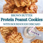 I took a popular Peanut Brown Butter Cookie recipe and adapted it for my sourdough protein kitchen. This version features rich brown butter, the gentle flavor from sourdough discard, and a boost of protein powder to create a cookie that hits all the right notes: it’s chewy, satisfyingly salty-sweet, and crunchy with peanuts. With 11 grams of protein per cookie, this recipe gives you a super satisfying snack that doesn’t sacrifice great flavor.