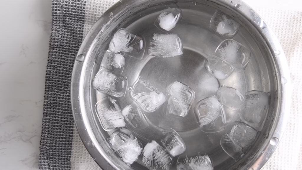 Get your mixing bowl ready and (if you are in a hurry) another, slightly bigger bowl that will fit your mixing bowl so it just touches the water, with cold water and ice.
