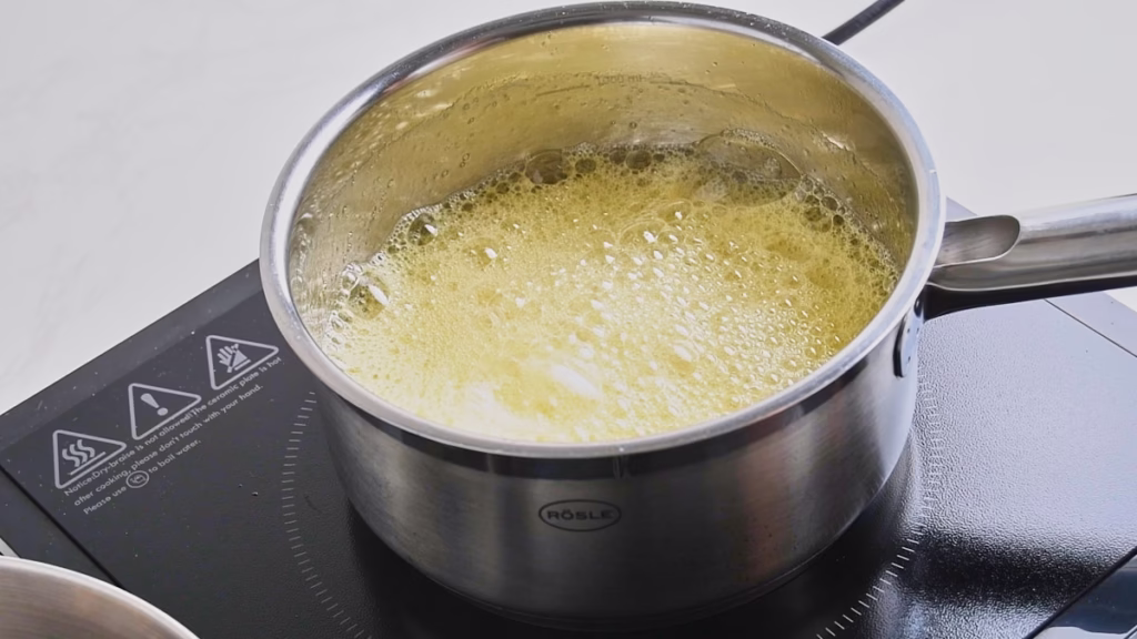 To do this, melt the butter on medium/high heat until it bubbles, then reduce the heat to medium/low and stir the melted butter until the big bubbles transform in a fine foam.
