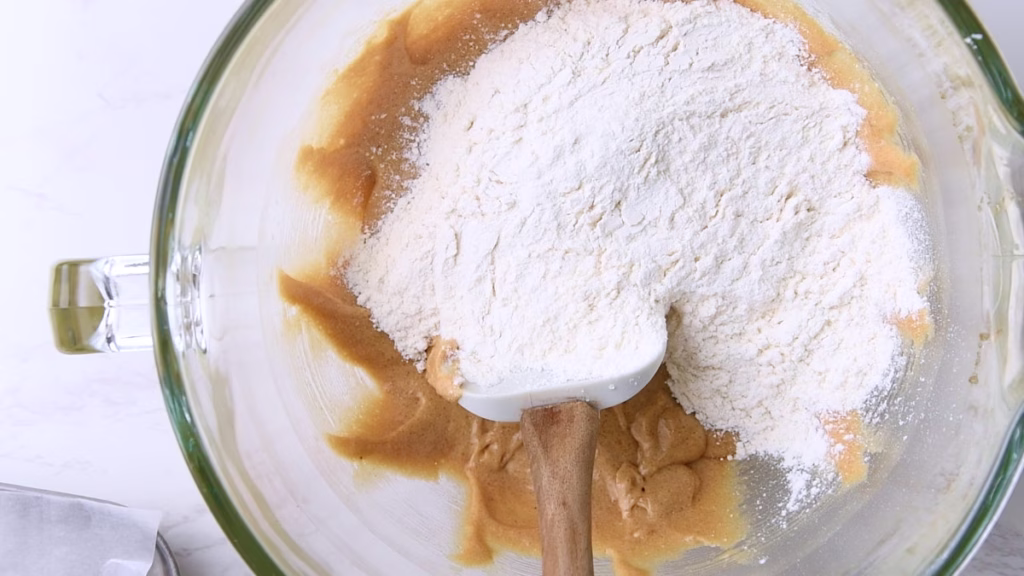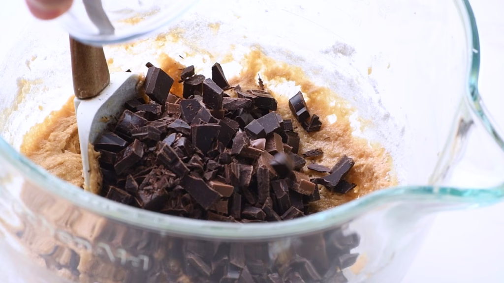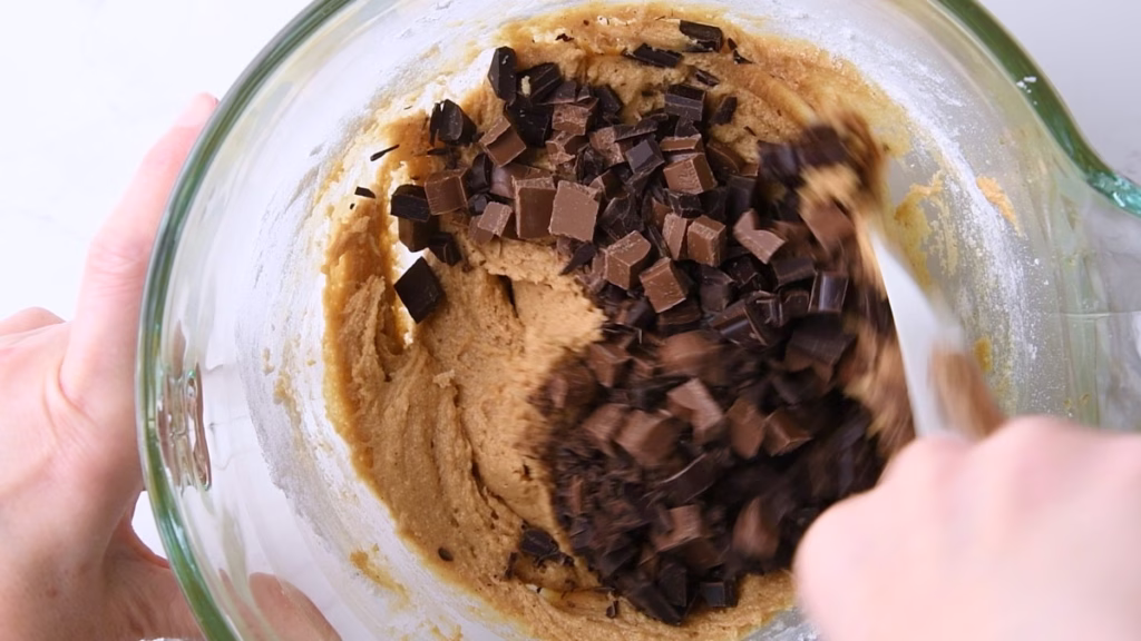 - Either in a separate bowl or on top of your batter, stir together the flour, salt and baking soda. Gently fold into the cookie dough. Don’t overmix, to prevent tough, rubbery cookies.