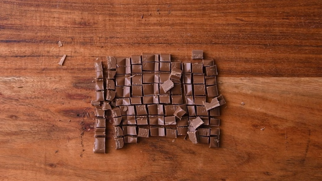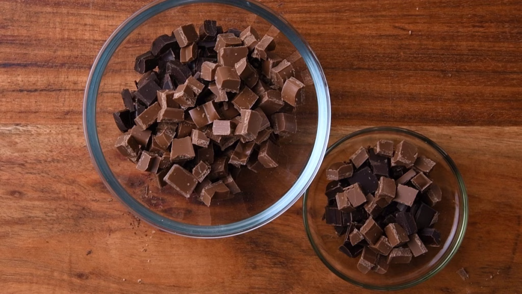 - Chop the chocolate into chunks. Mine where about 1/4 in/0.5 cm. Maybe a tiny bit bigger. Put about 12-18 nice pieces of each type to the side, to top the cookies later. Keep all those lovely tiny chocolate shavings in the mix for the dough. They create a sort of chocolate marbling in the cookies.