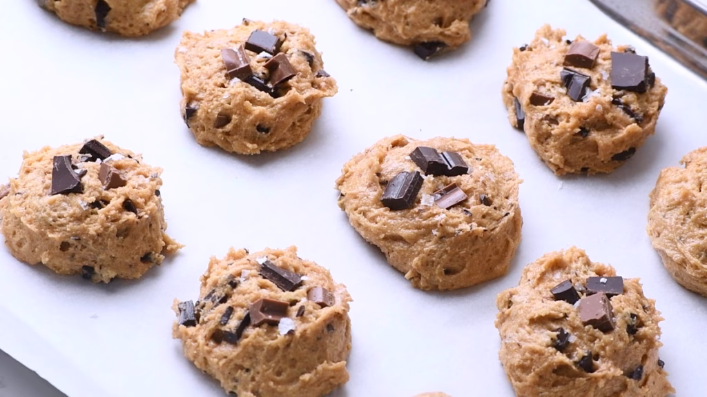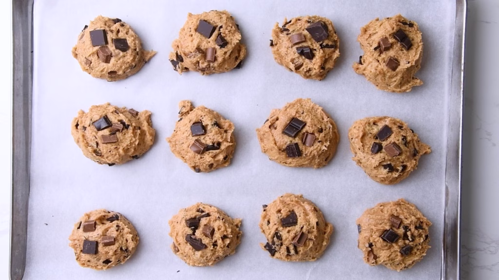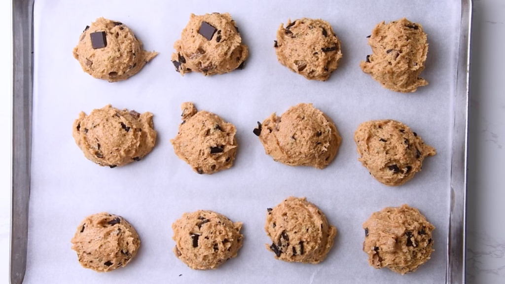 - Grab your parchment lined sheet pan and cookie scoop and portion out about 12 cookie dough balls.