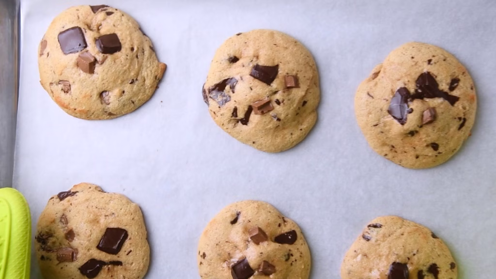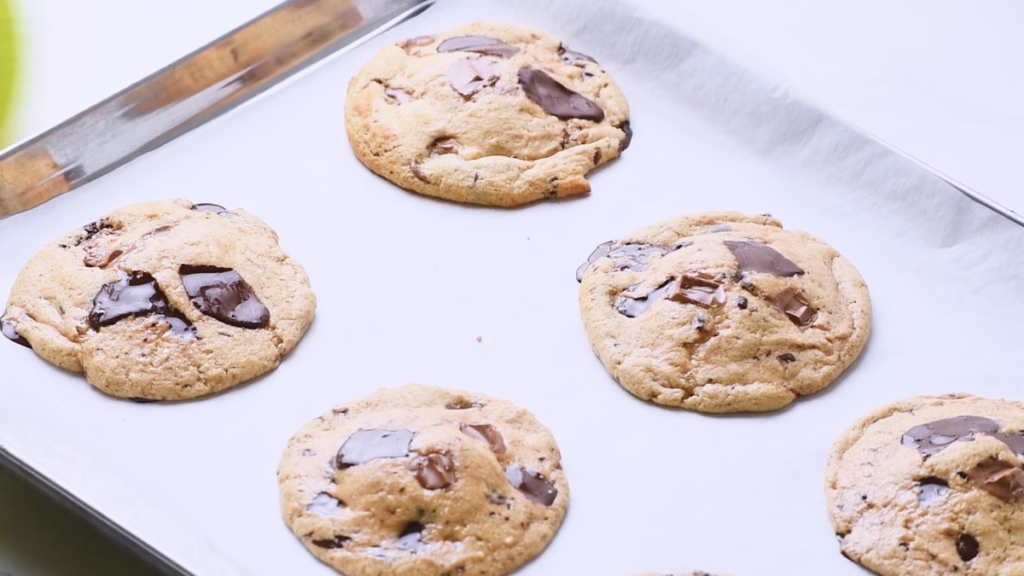 - This is the secret to the perfect fudgy middle of chocolate chip cookies. They will continue to bake outside the oven for a few minutes. If they are not rippled enough yet or have a very puffy center, bang the pan again when taking them out.