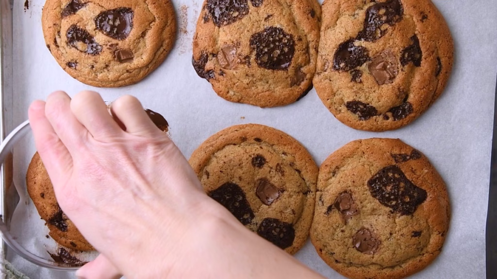 - But just one more step first: Get the chocolate pieces you put aside earlier and top each cookie with 2-3 of them. Then sprinkle with a little bit of flaky sea salt if you like.