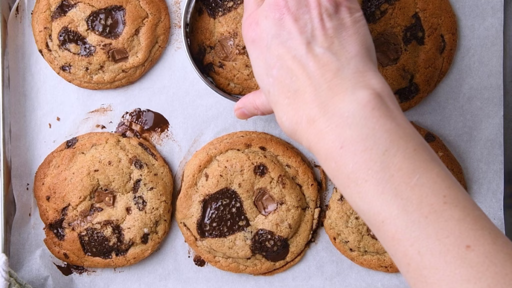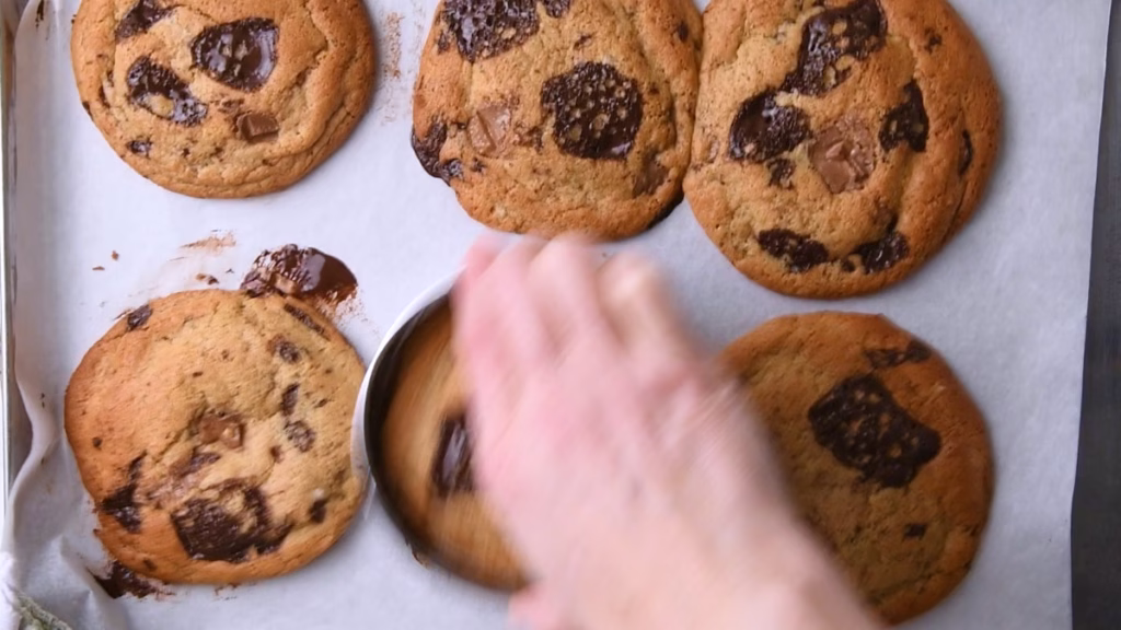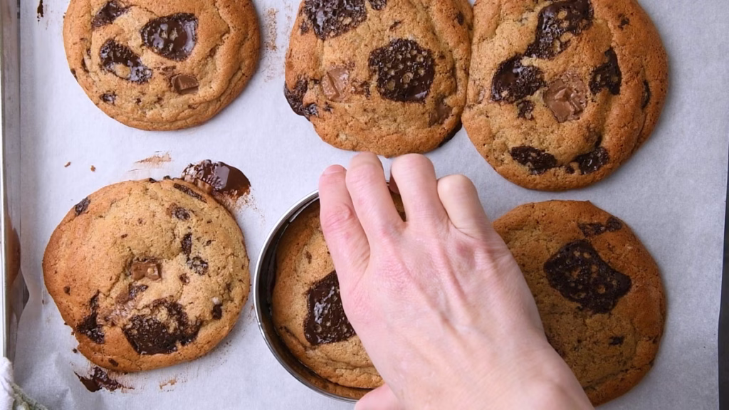 - If you’d like perfectly round (and even more rippled) cookies, grab that large cookie cutter while they are still hot and soft. It should be slightly bigger than your biggest cookie.