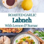 Roasted Garlic Lemon Labneh is a super creamy spread made from strained Greek yoghurt with mild and caramelized roasted garlic and zesty lemon, rounded with some lemony sumac.