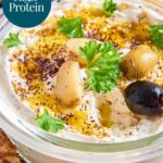 Did you know that Labneh is an even higher protein spread than greek yoghurt? It’s made by straining the yoghurt through a cloth or coffee filter, then adding any seasonings you enjoy. In this case simple roasted garlic and lemon zest.